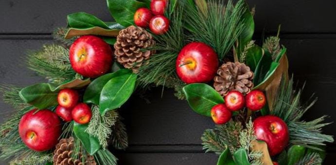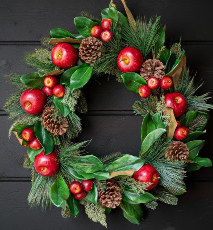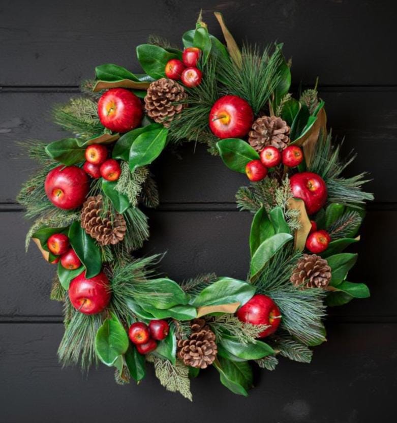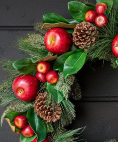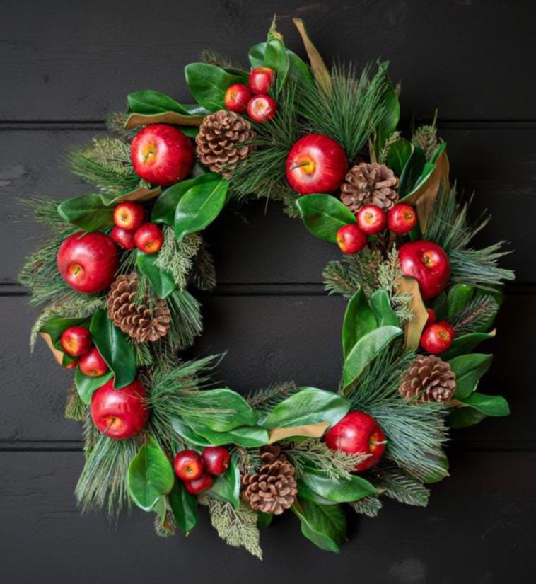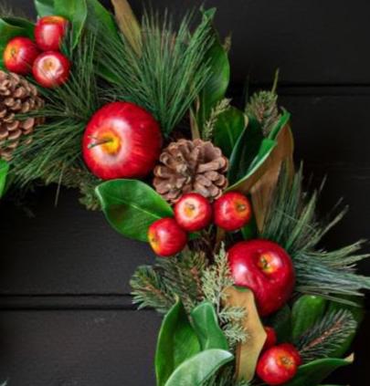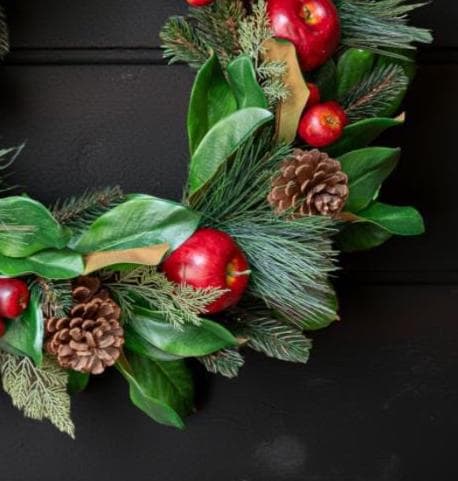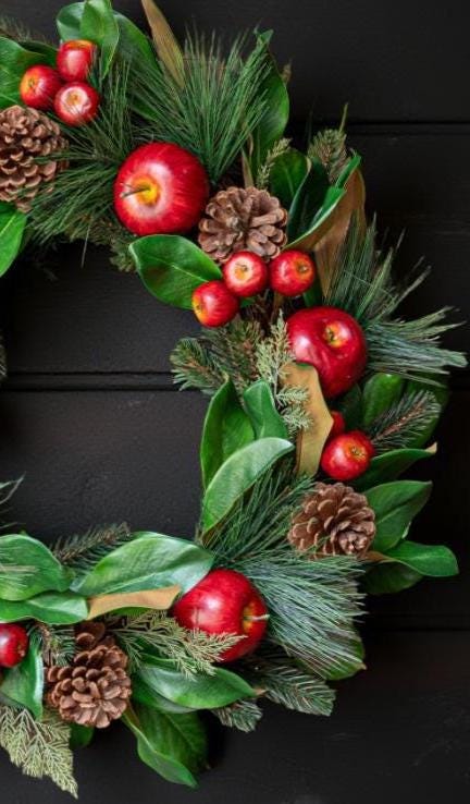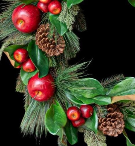 Welcome the holiday season with this elegant Williamsburg inspired Wreath. This full and lush wreath combines realistic Magnolia leaves with Pine and Cedar greenery, pinecones and is adorned with beautiful Red apples, creating a timeless winter accent for your home. Perfect for hanging on your front door, over a mantel, as a table centerpiece or as part of your holiday wall décor, this wreath blends classic charm with natural beauty.m Add a bow or other DIY touches to make it your own!