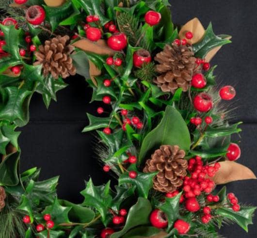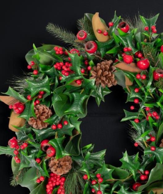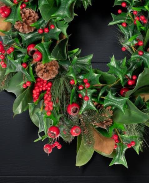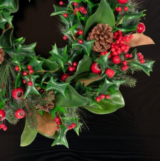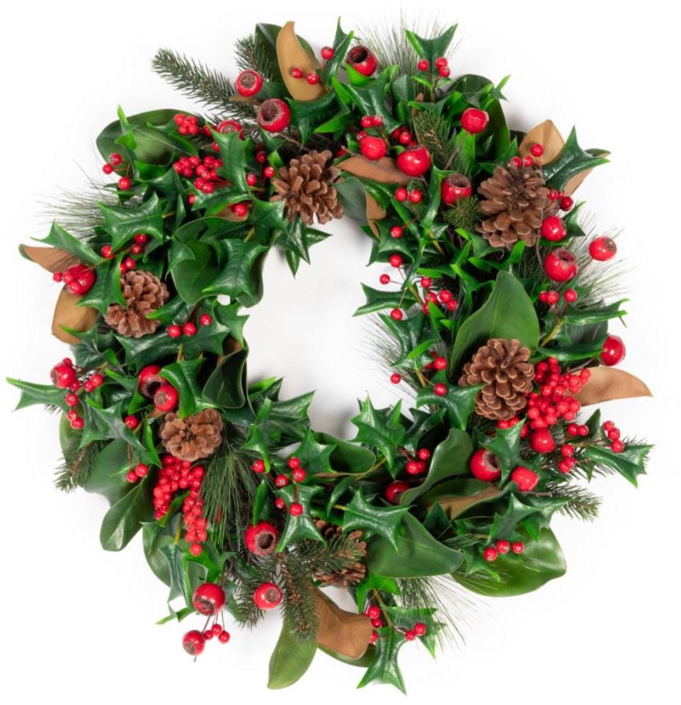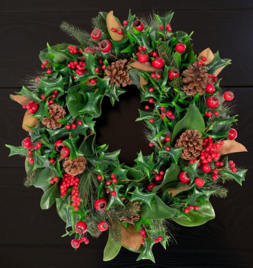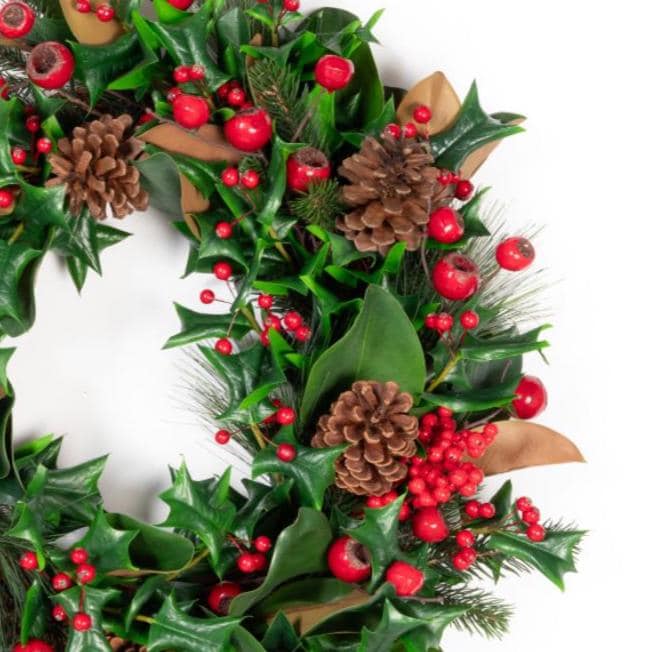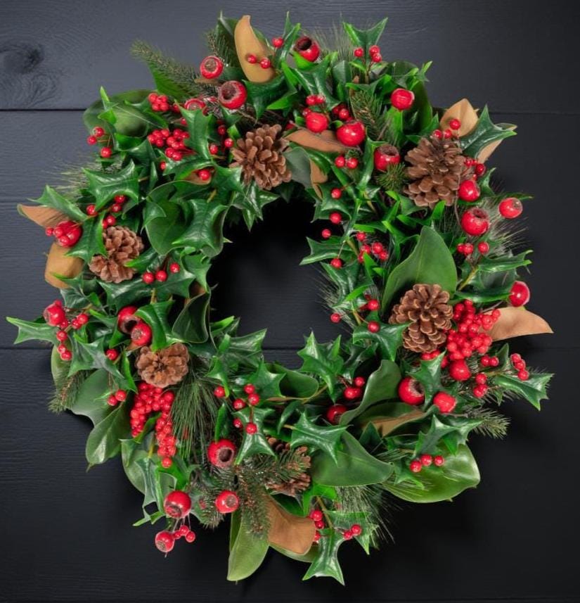 Welcome the holiday season with this elegant full and lush wreath combining realistic Magnolia leaves with Holly and Pine greenery, pinecones and is adorned with beautiful Red berries, creating a timeless winter accent for your home. Perfect for hanging on your front door, over a mantel, as a table centerpiece or as part of your holiday wall décor, this wreath blends classic charm with natural beauty.m Add a bow or other DIY touches to make it your own!
