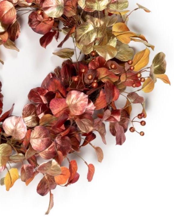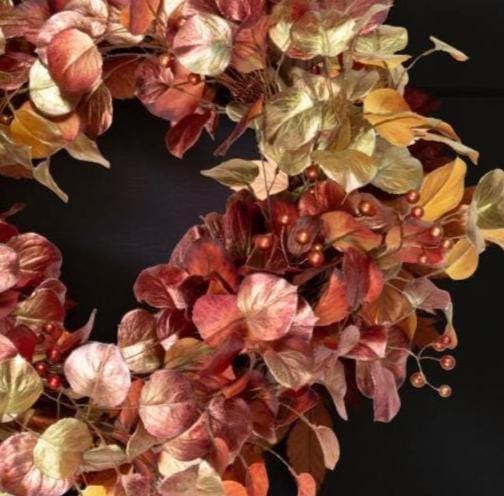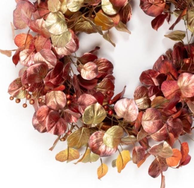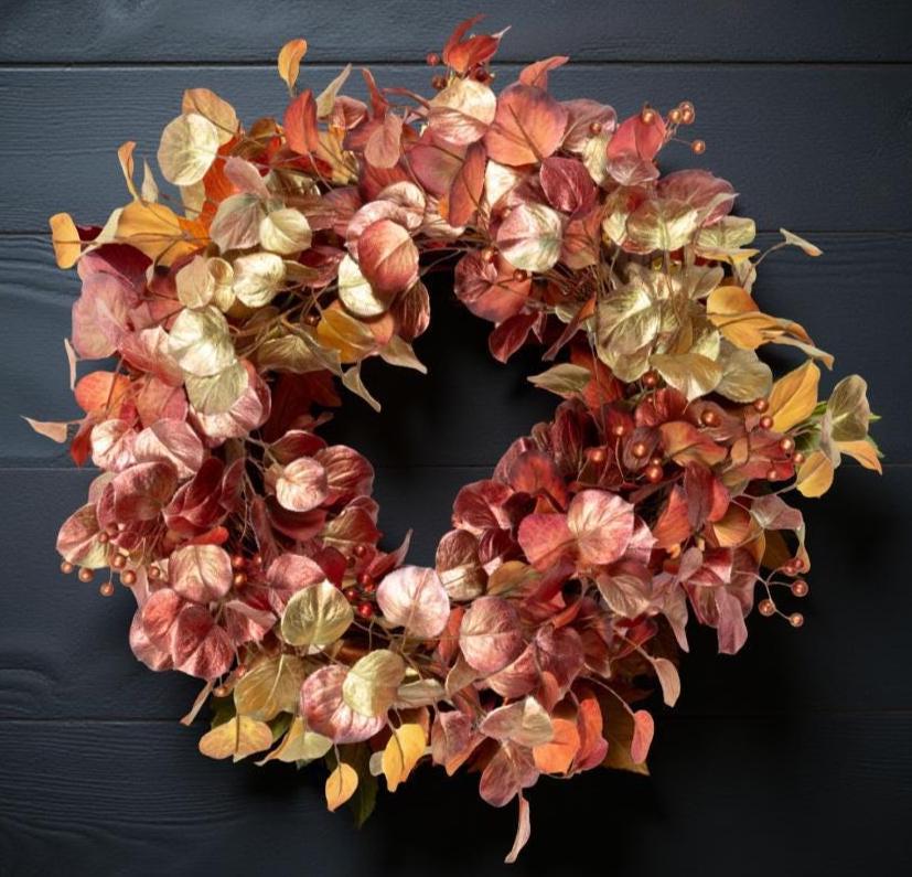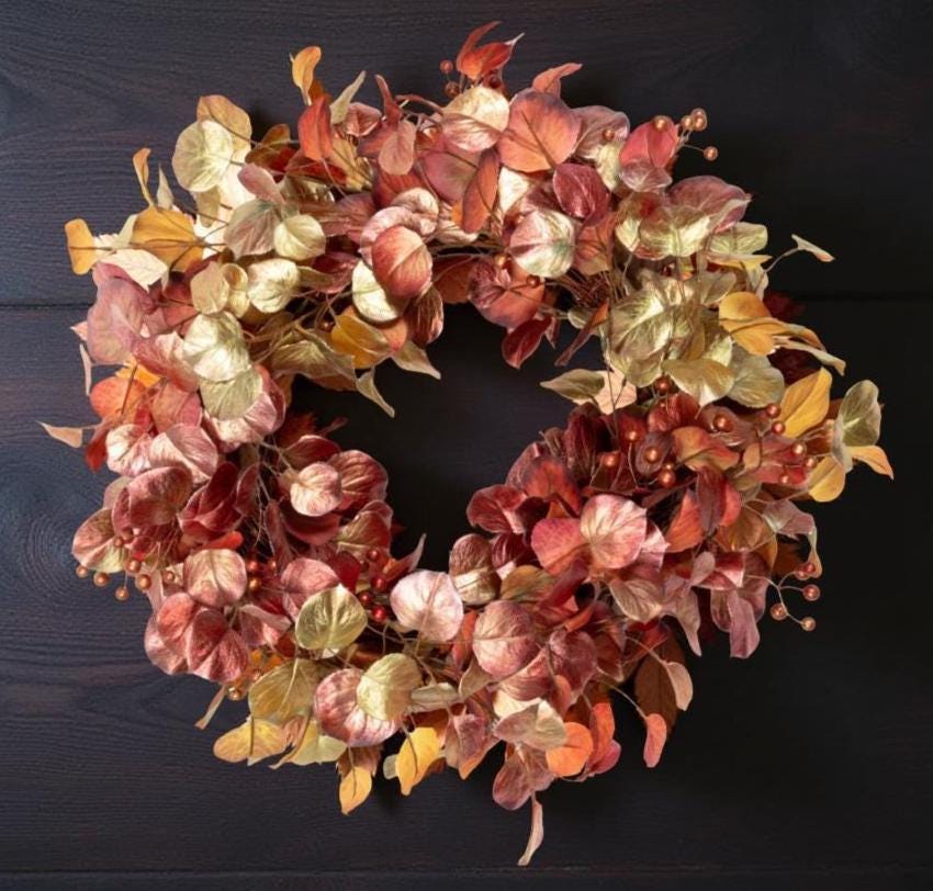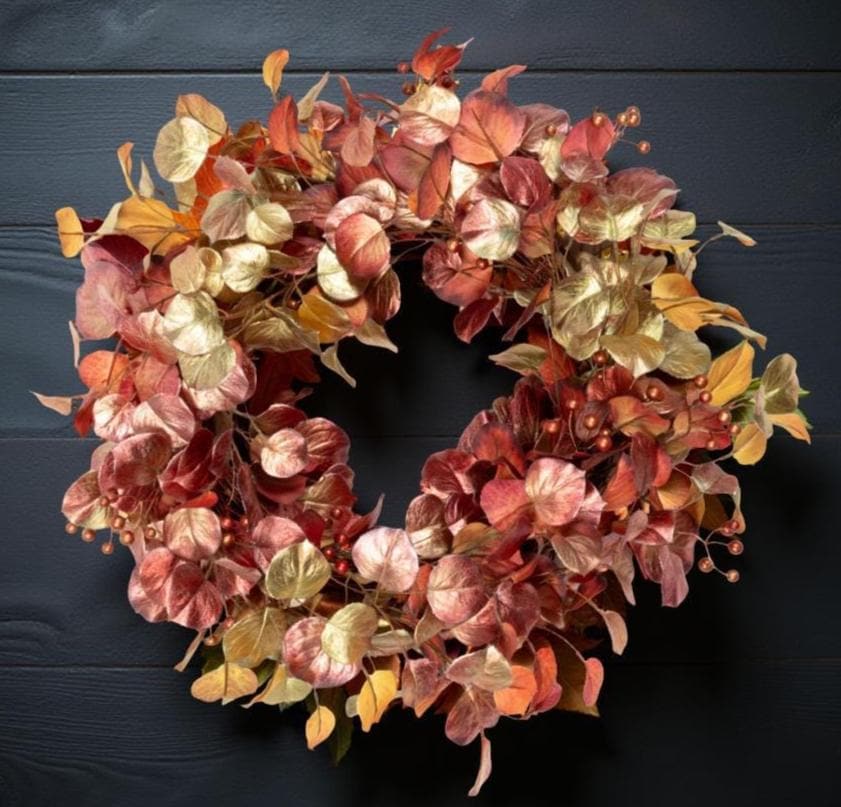 This Fall wreath will bring all of the warm Autumn feels into any space! It features an elegant blend of metallic leaves in rich shades of Pink, Gold and Copper, creating a stunning ombre effect that embodies the essence of Fall. Make a statement on a doors, wall, mantel, or even use as a table centerpiece. The metallic tones add a touch of elegance and it is versatile enough to work in a variety of decor from rustic to modern.
