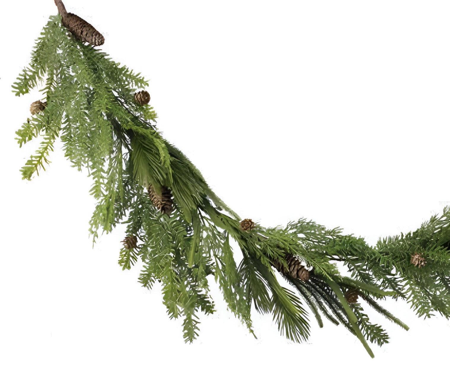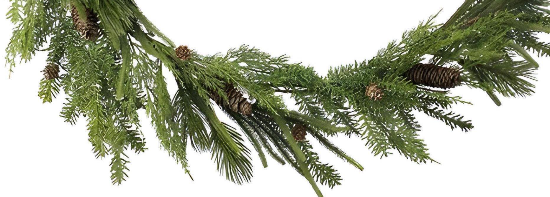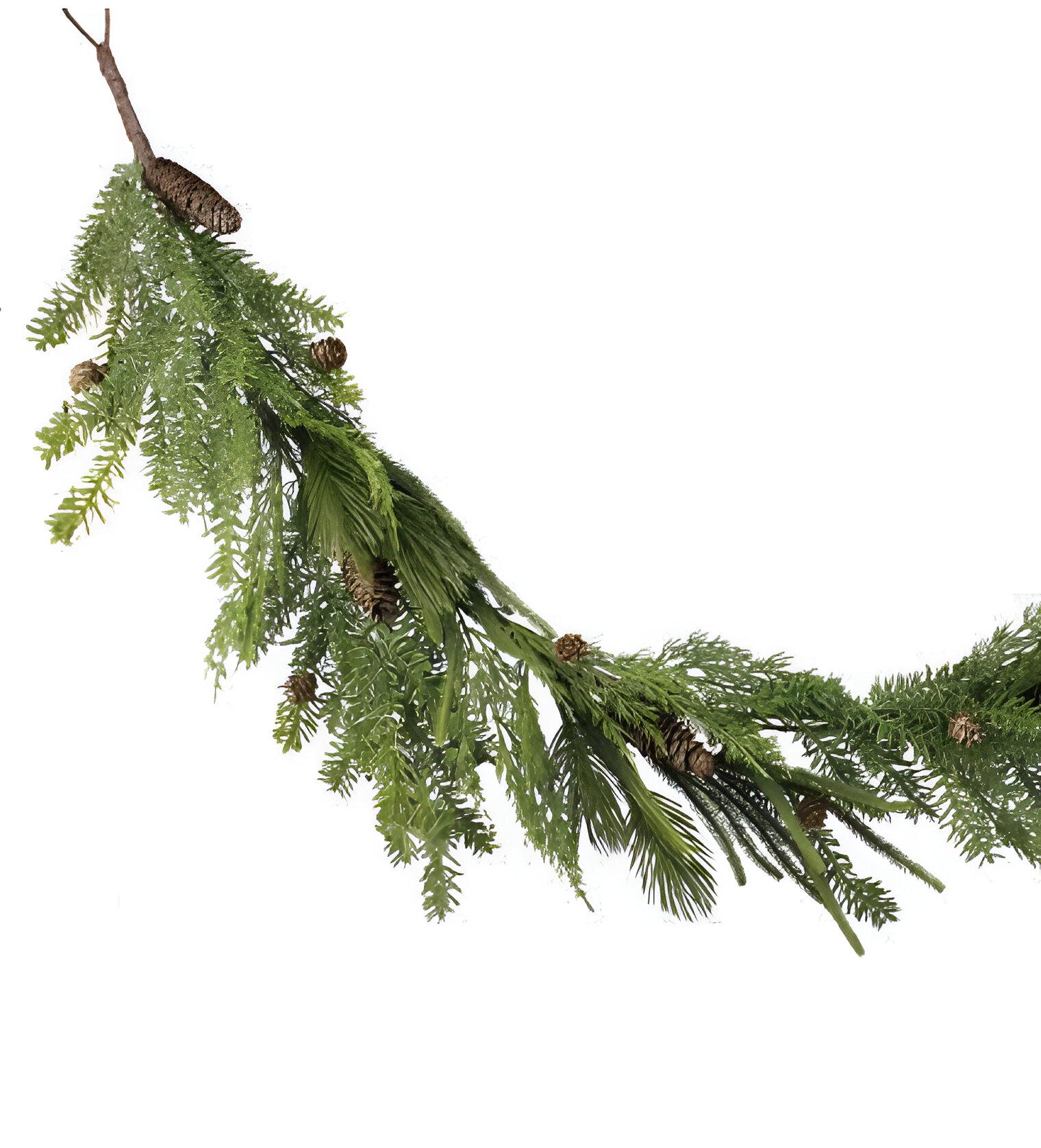This is a mixed Christmas garland in 2 tone Green featuring Cedar, Juniper and Pine with Pinecone accents that has a very realistic look. You can drape needed over your mantel, stairs, doorway or use it as a table runner, as a part of your tablescape other DIY projects.