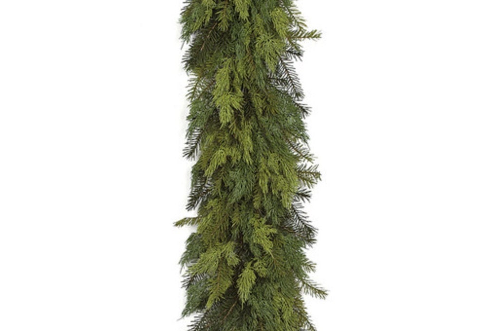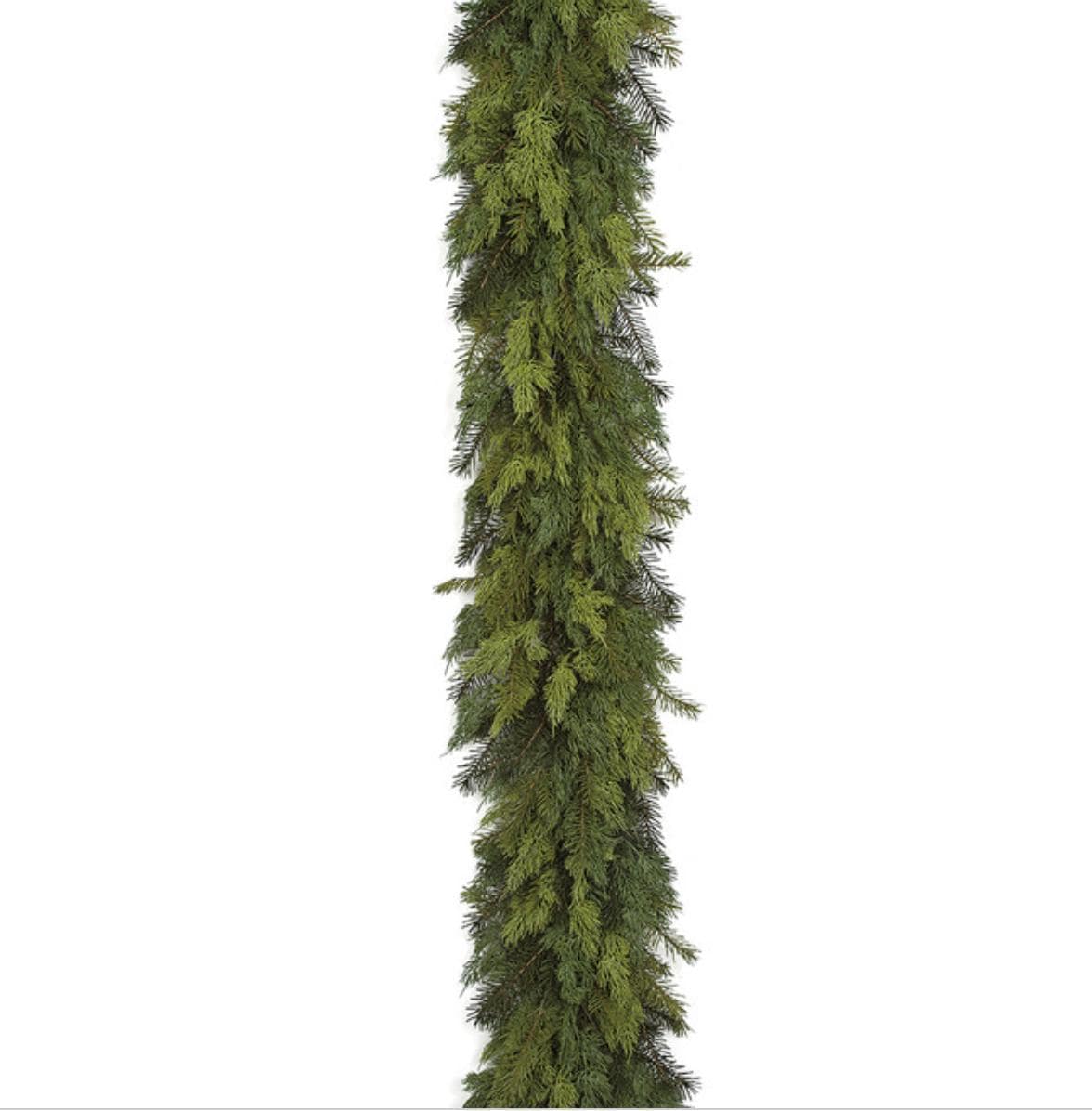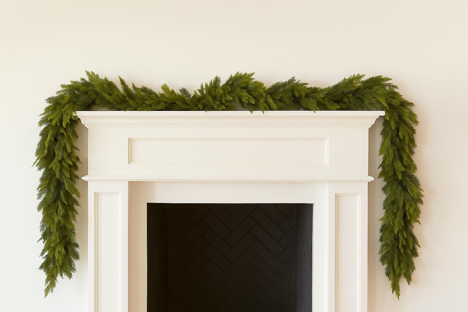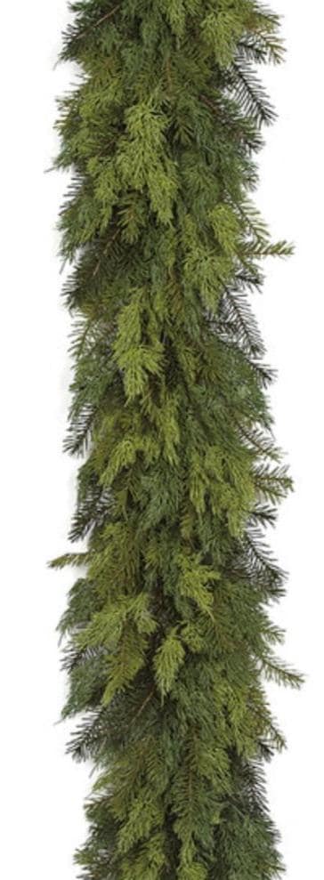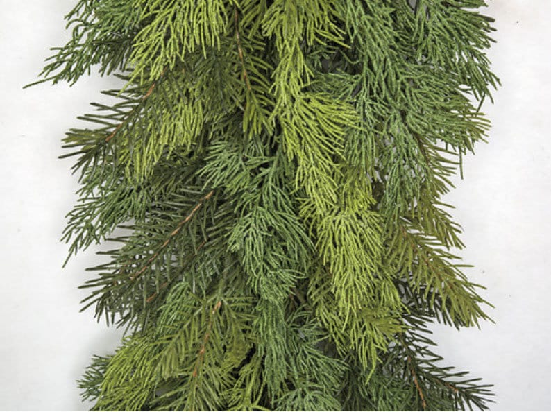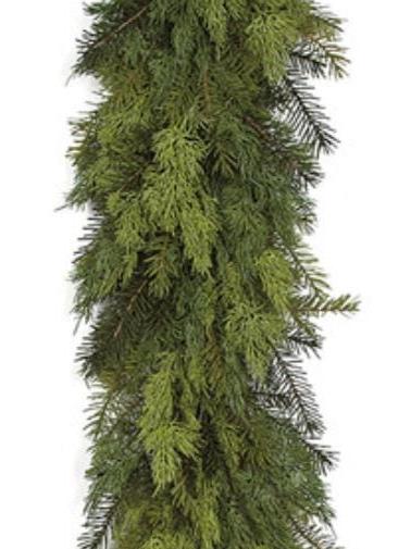 This is a very substantial and high quality artificial natural touch Mixed Pine garland and has a very natural look and feel. Shape it as you need to drape it over your mantel, stairs, doorway or use it as a table runner or for making DIY wreaths or other holiday projects. Picture 1 shows two garlands styled on mantel.
