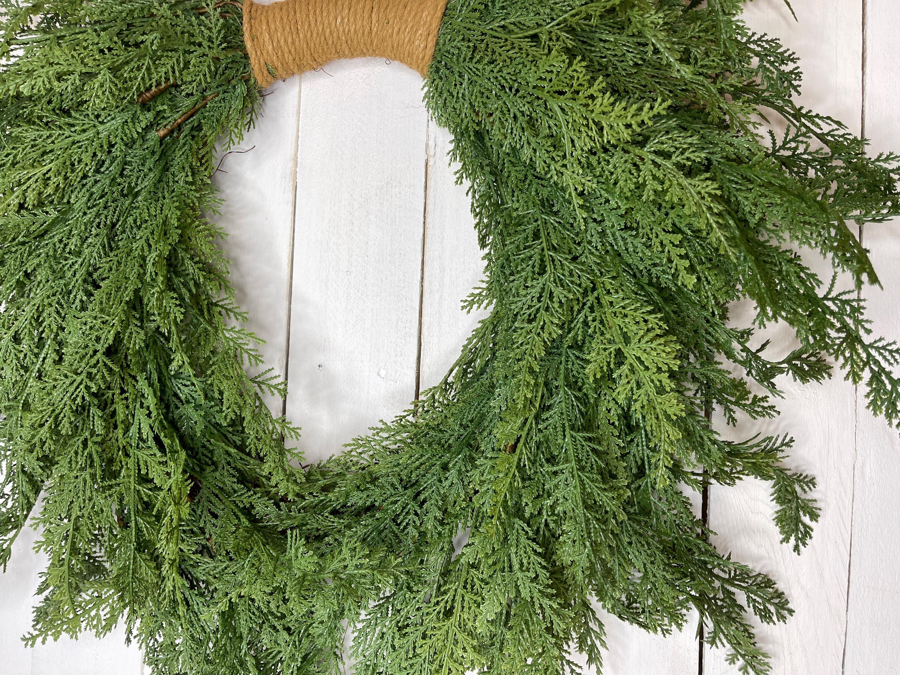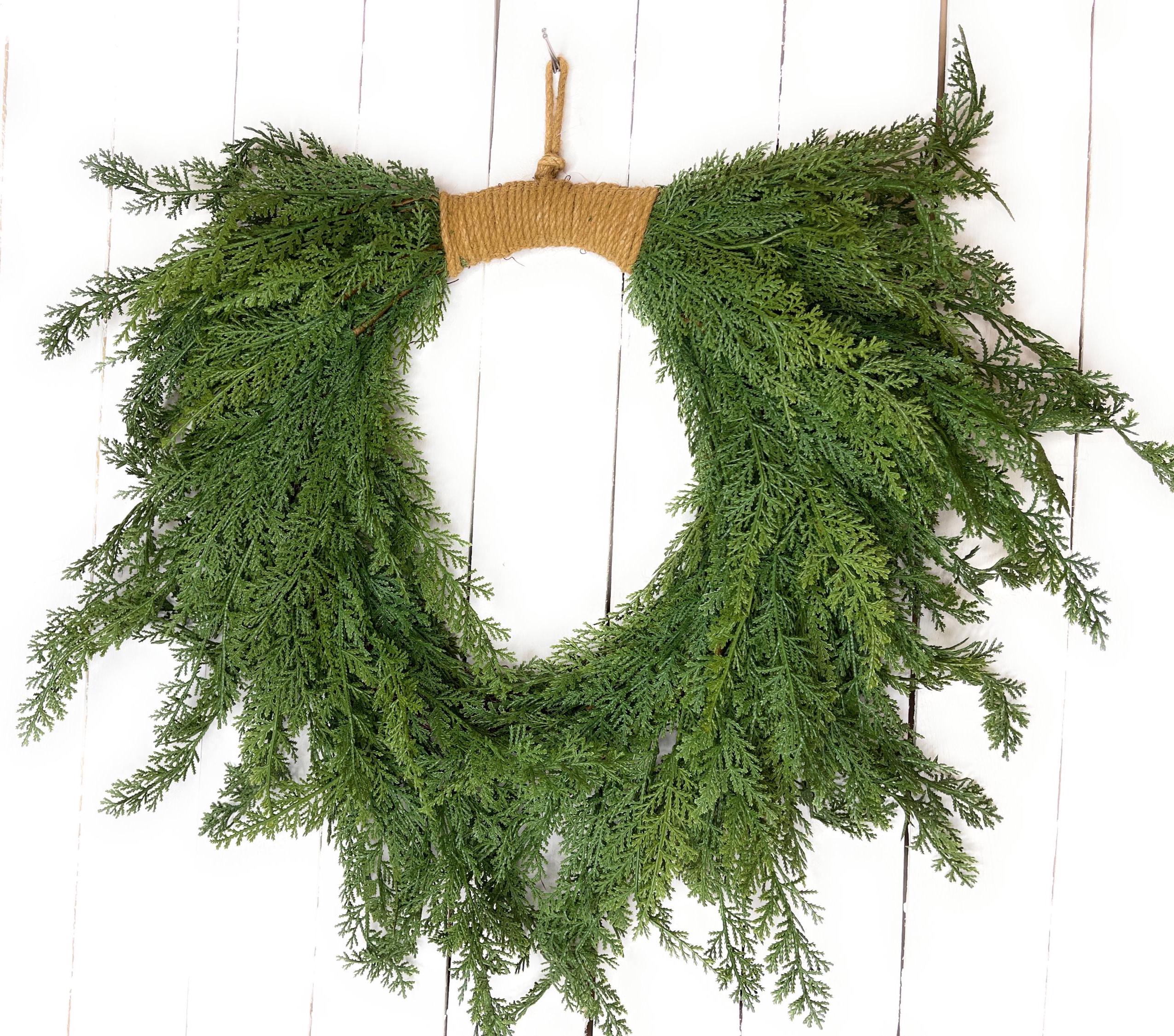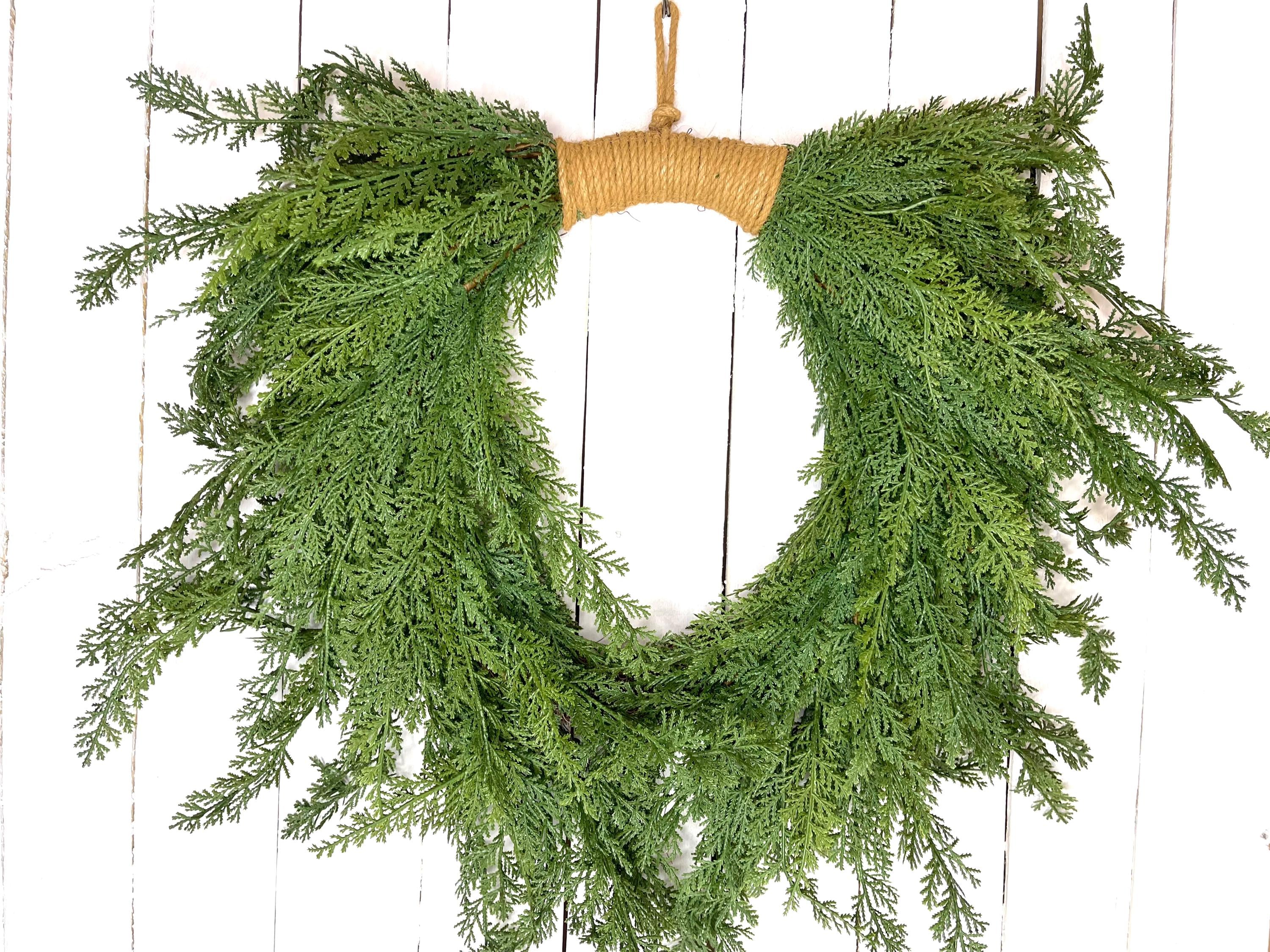Celebrate the holiday season with the perfect blend of natural rustic charm and festive elegance! This faux real touch Cedar wreath features realistic draping Cedar branches sprigs that are soft to the touch and designed to look fresh throughout the holiday season without all of the mess. It's adorned with a jute wrapping for a little rustic charm which serves as its hanger.