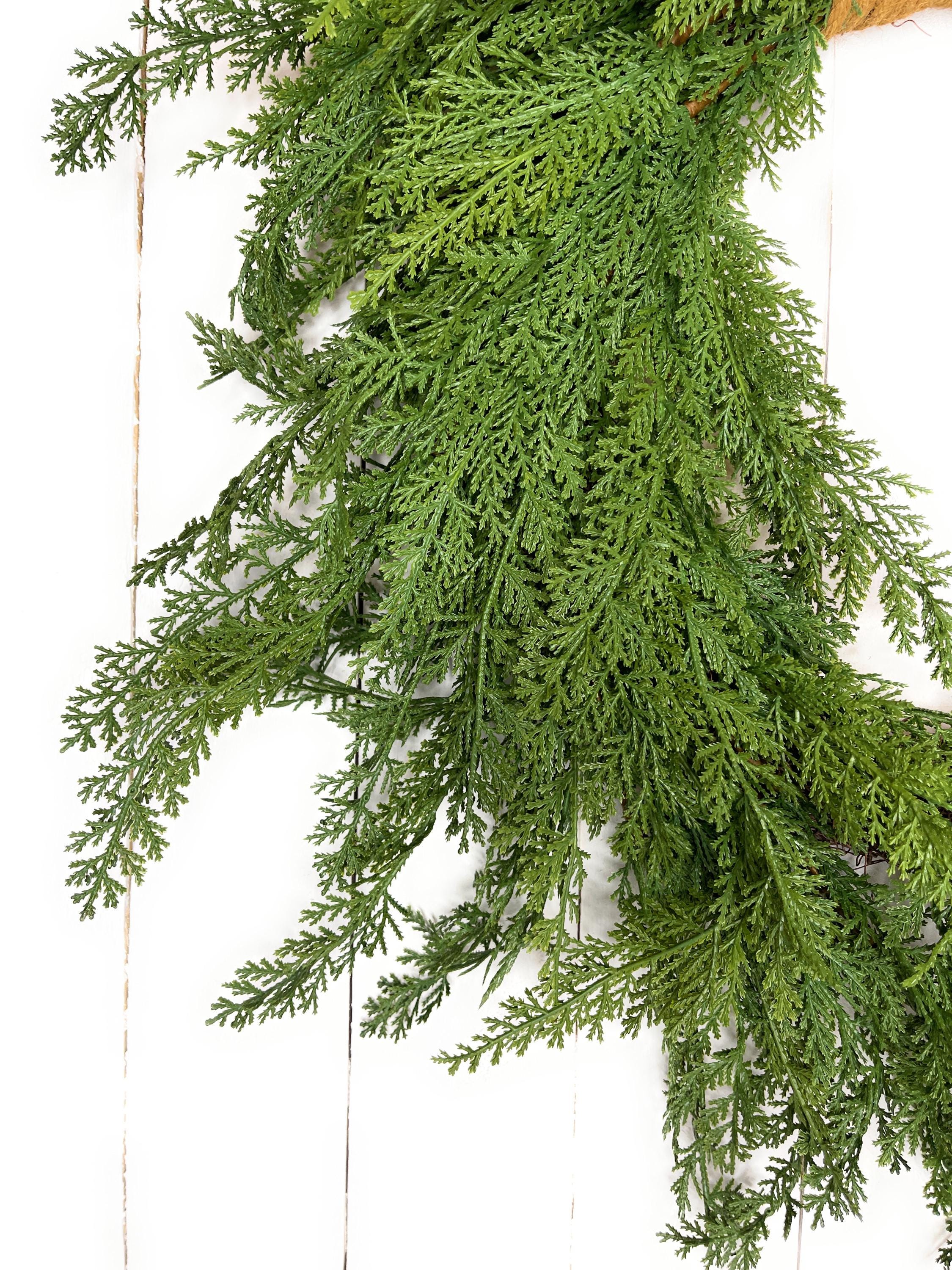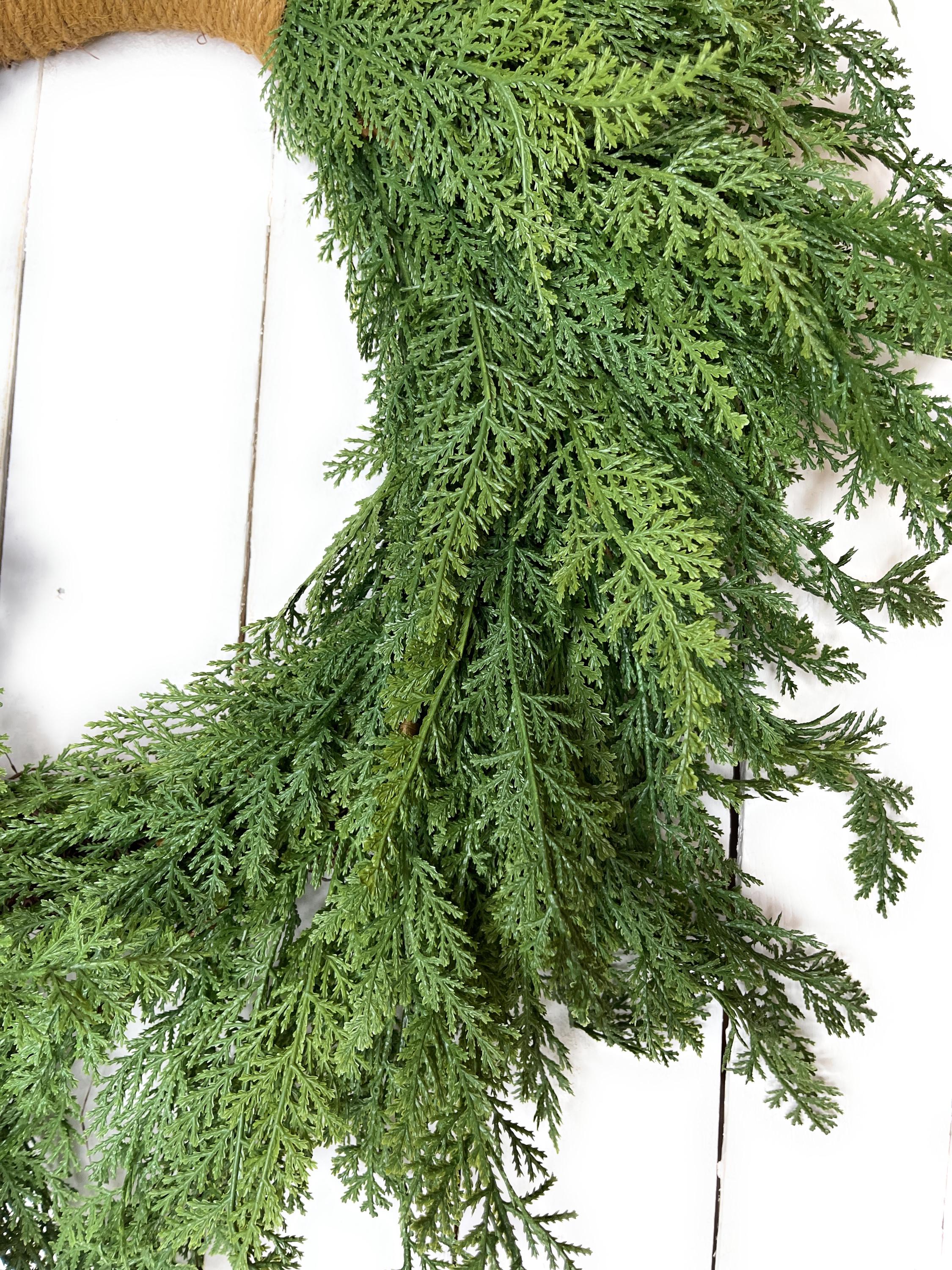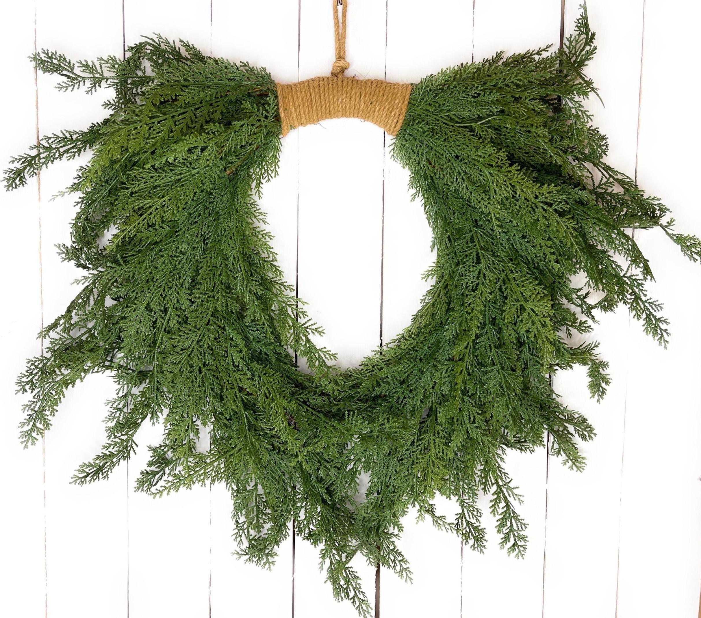 Celebrate the holiday season with the perfect blend of natural rustic charm and festive elegance! This faux real touch Cedar wreath features realistic draping Cedar branches sprigs that are soft to the touch and designed to look fresh throughout the holiday season without all of the mess. It's adorned with a jute wrapping for a little rustic charm which serves as its hanger.