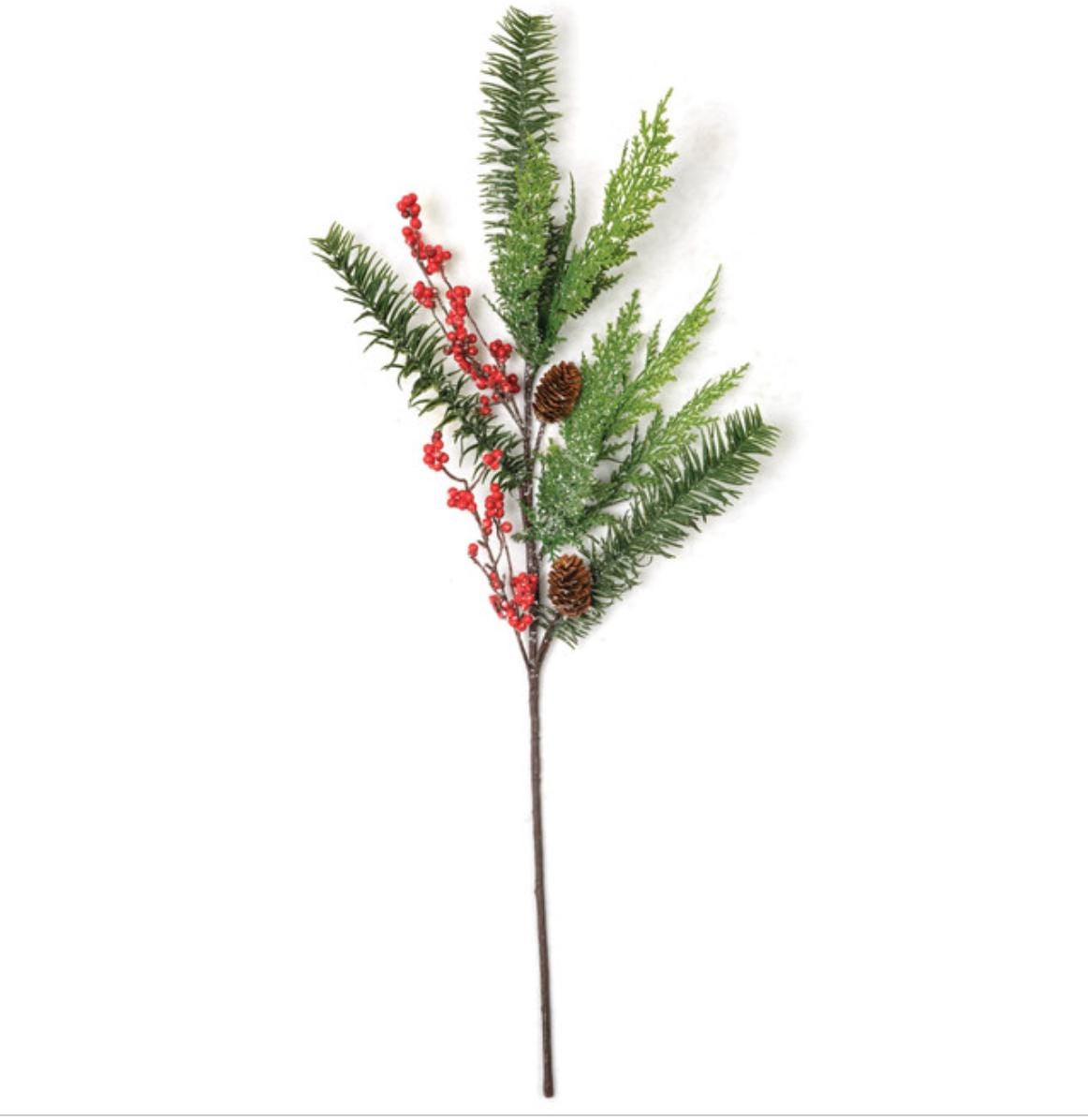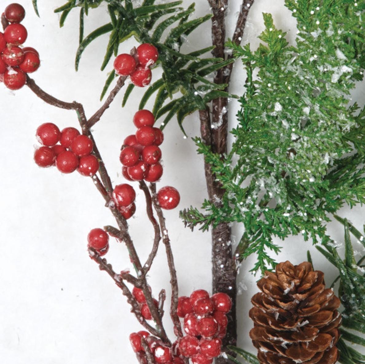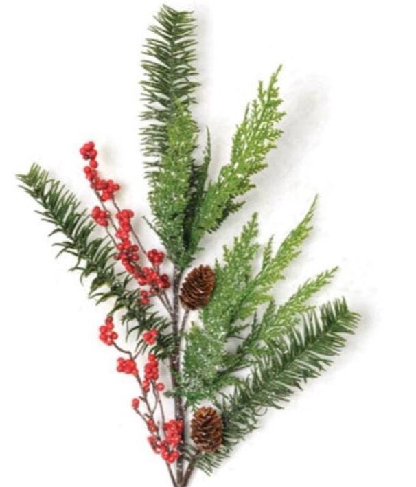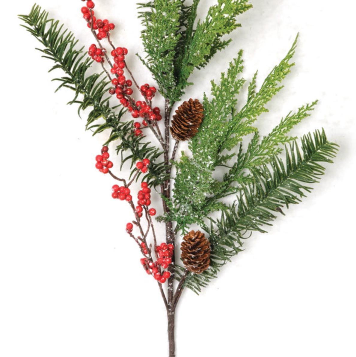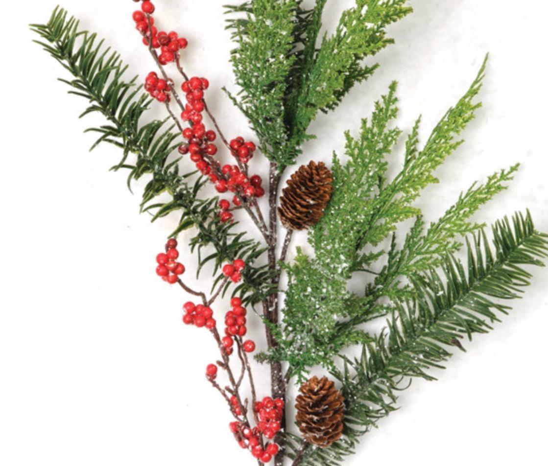 This faux Mixed Cedar Spray with Pine, Berry and Pinecone accents will add rustic elegance and depth to your holiday decorating! Use in a decorative wreath, add to a vase, mantel or table centerpiece display, planter, add to a tree as a tree filler or use in other Winter or Christmas DIY floral creations.