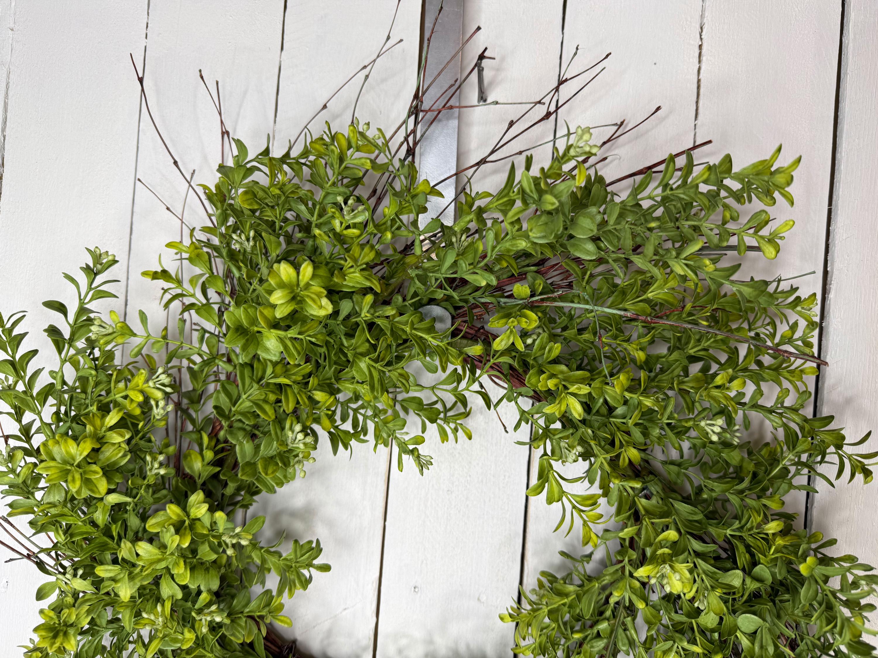 Faux rustic flowering boxwood wreath for front door with natural greenery and twig detail. Perfect year round farmhouse decor for entryway styling.