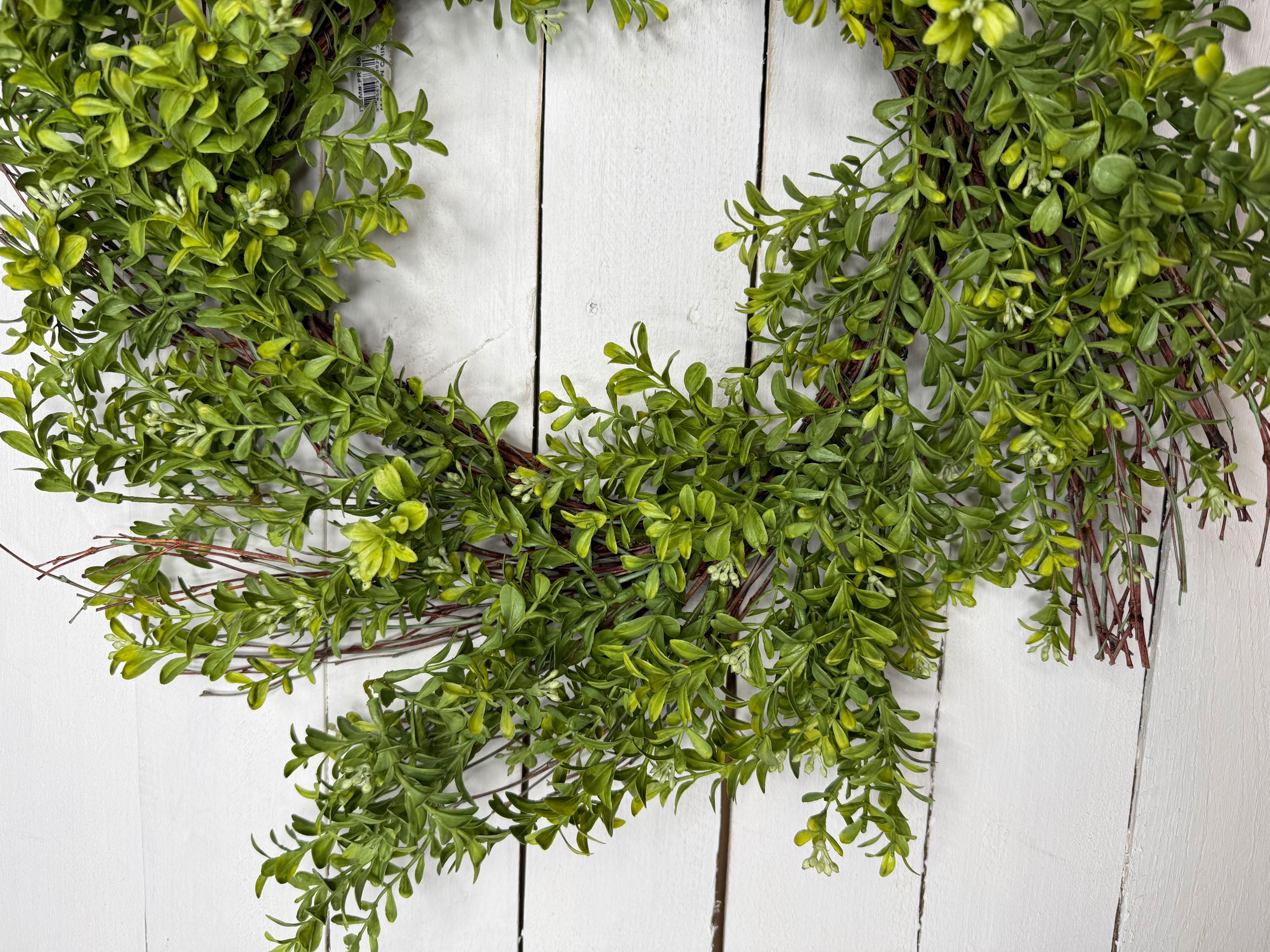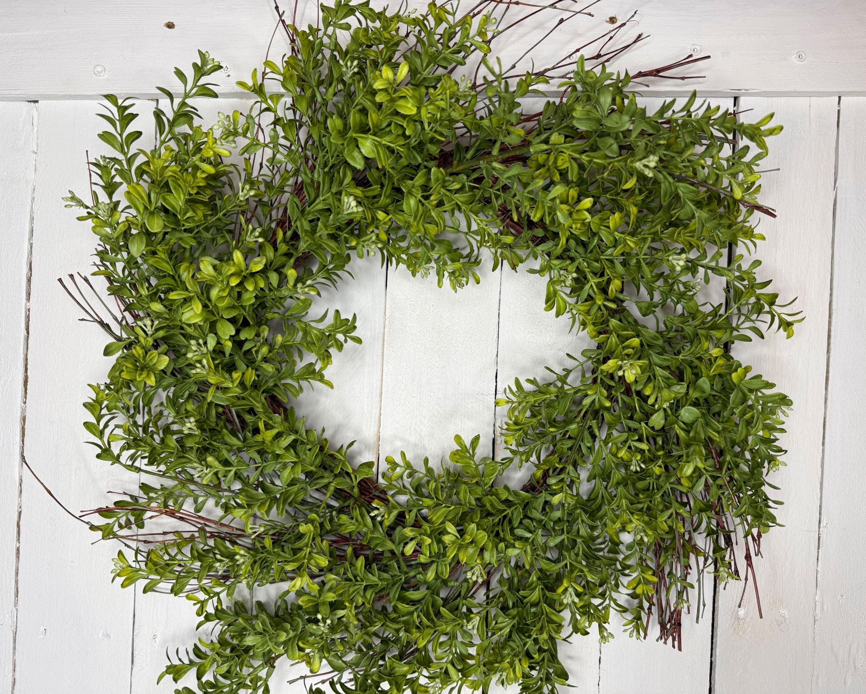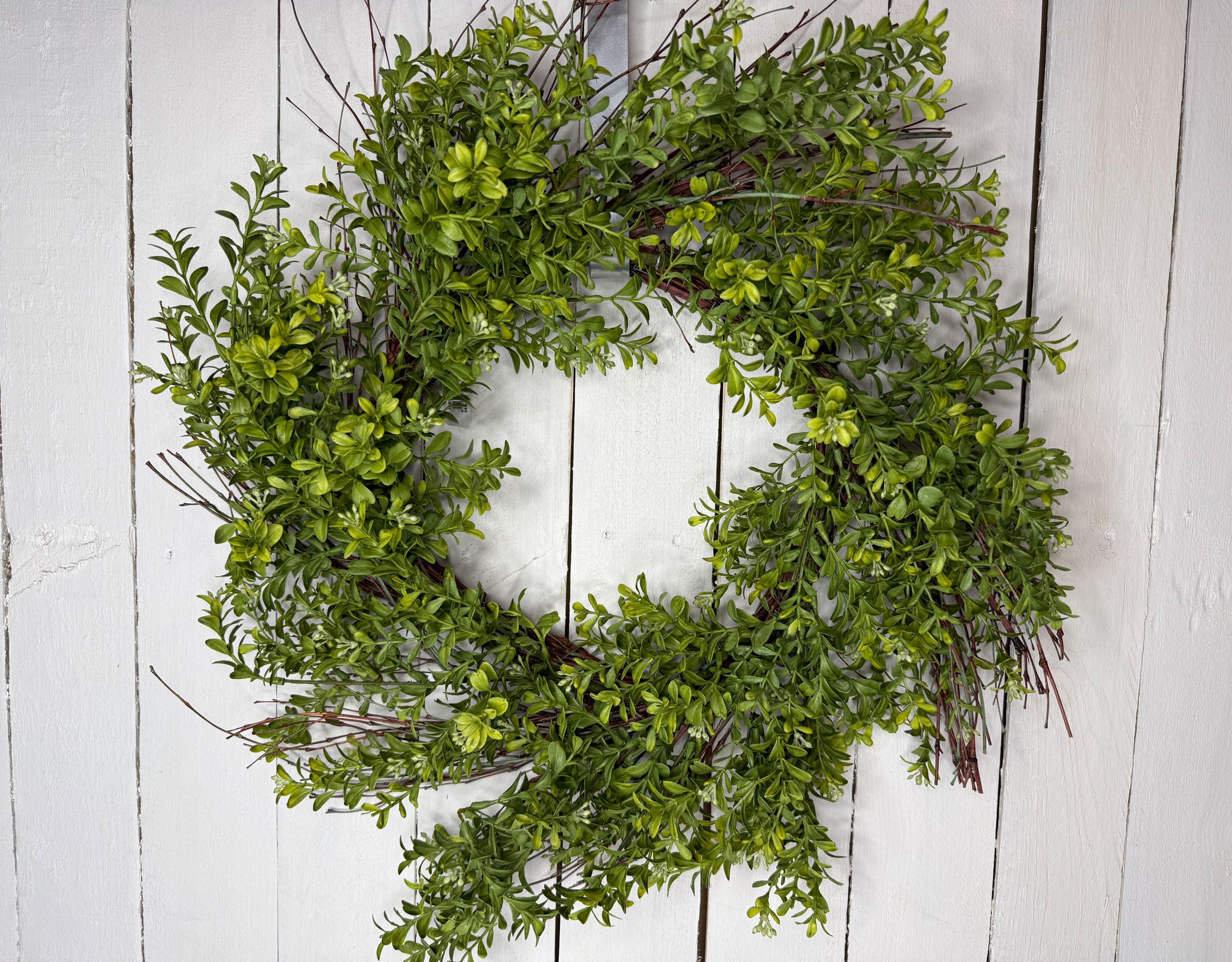Add natural charm to your home with this faux rustic flowering boxwood wreath. Designed with lush greenery and organic twig accents, this wreath offers a slightly wild, handcrafted look that brings warmth and texture to any space.