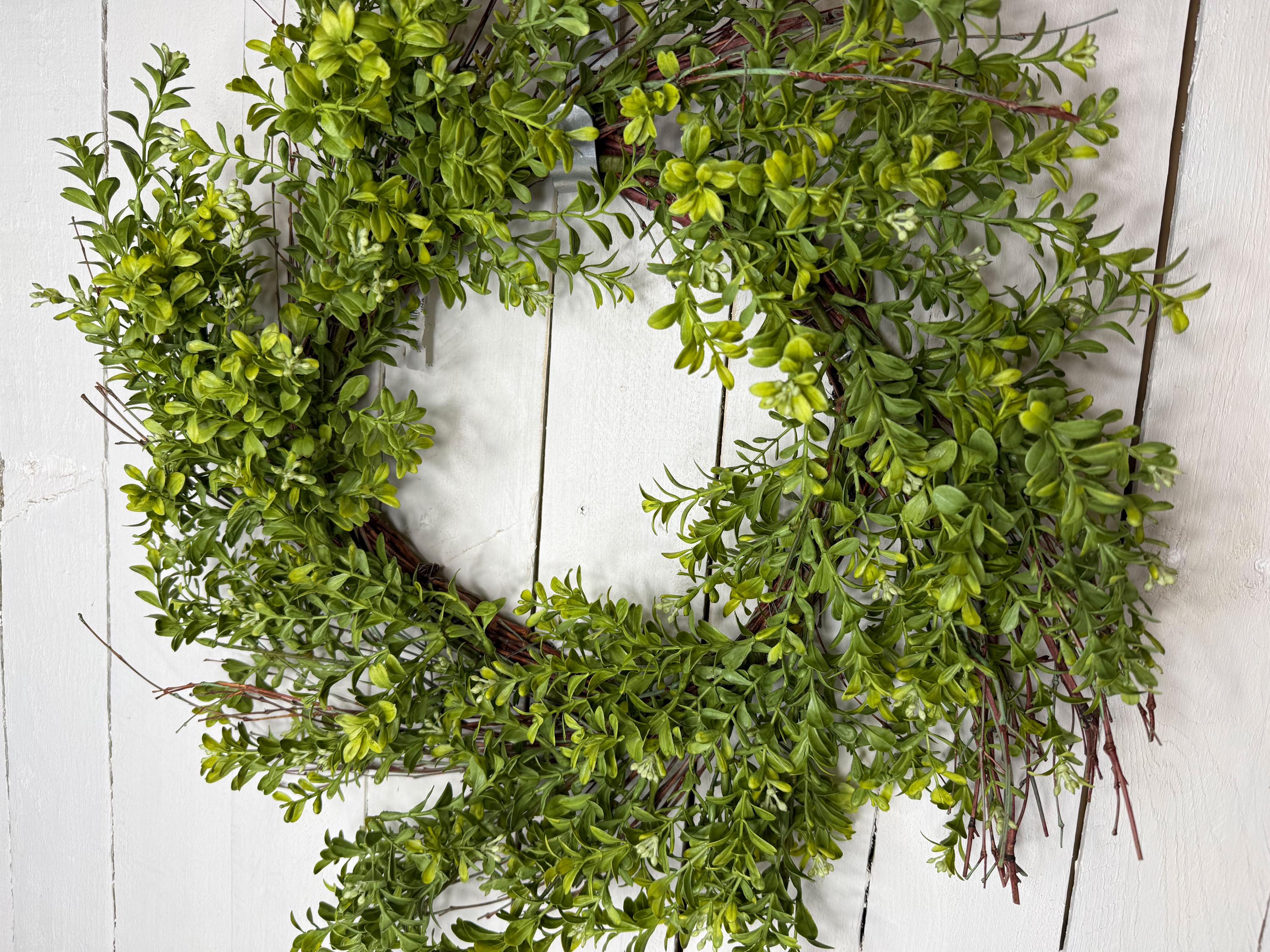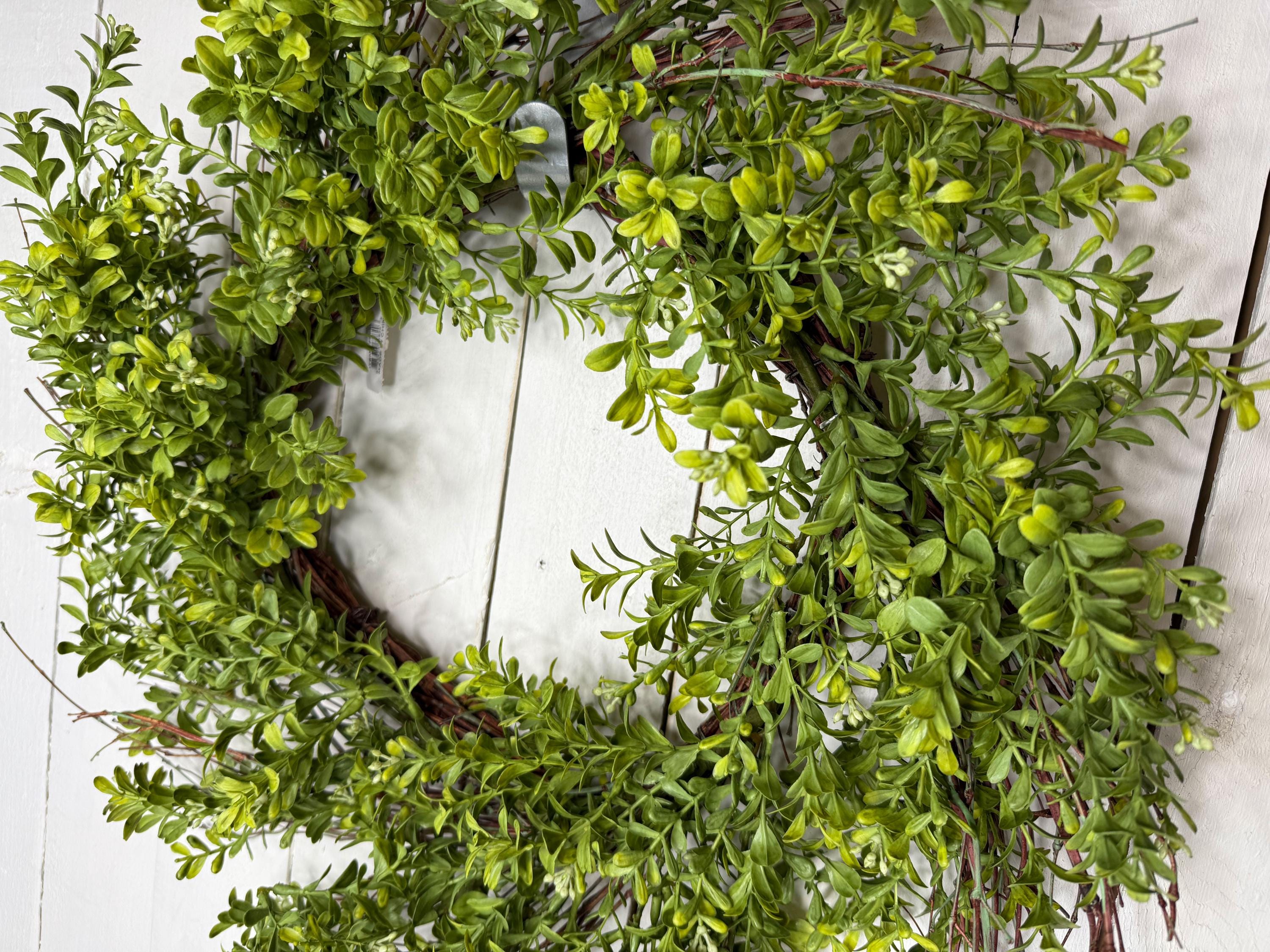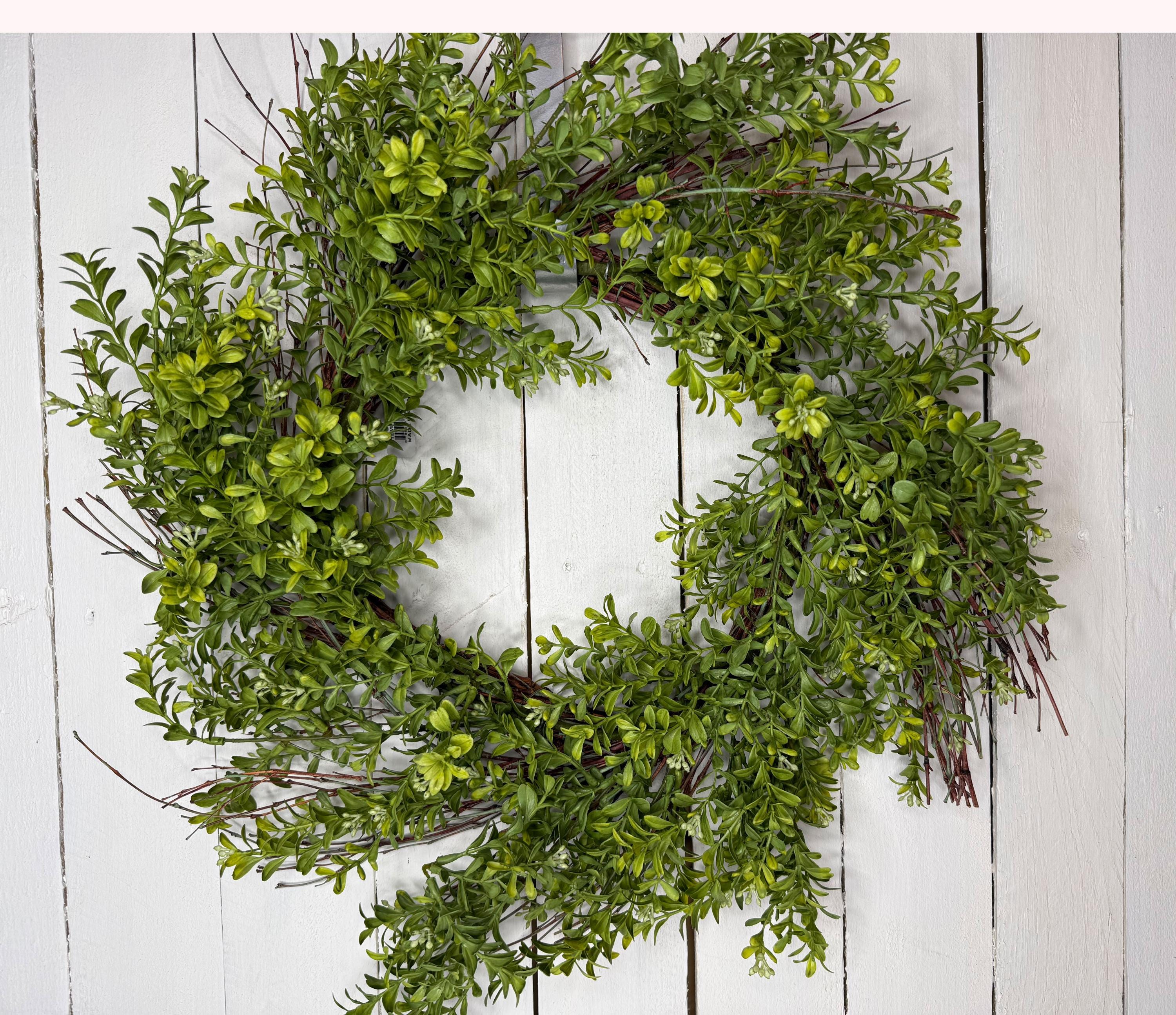 Add natural charm to your home with this faux rustic flowering boxwood wreath. Designed with lush greenery and organic twig accents, this wreath offers a slightly wild, handcrafted look that brings warmth and texture to any space.