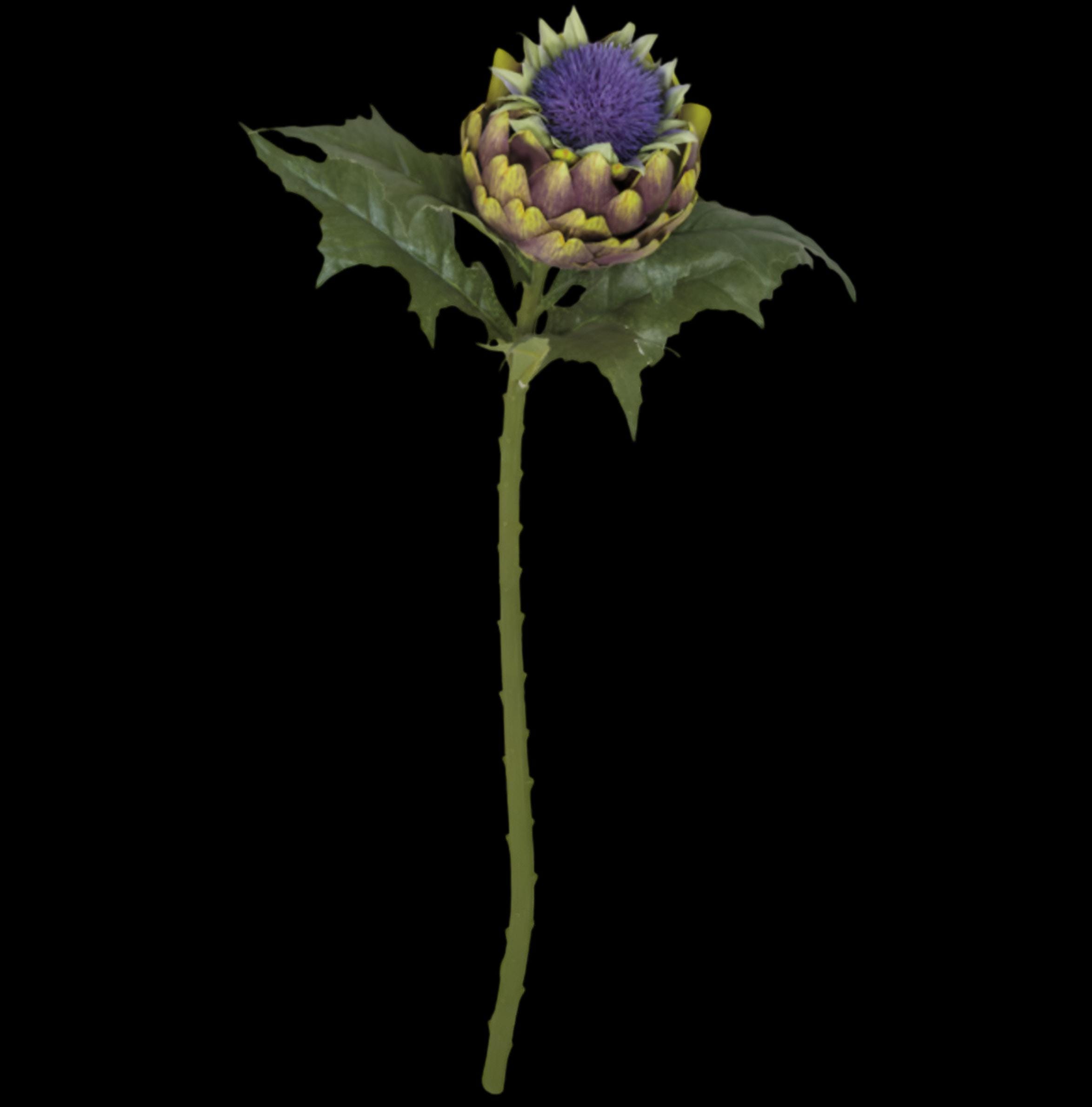 Add a unique botanical touch with this artificial open flowering artichoke stem, featuring layered green and purple tones with a realistic textured center.