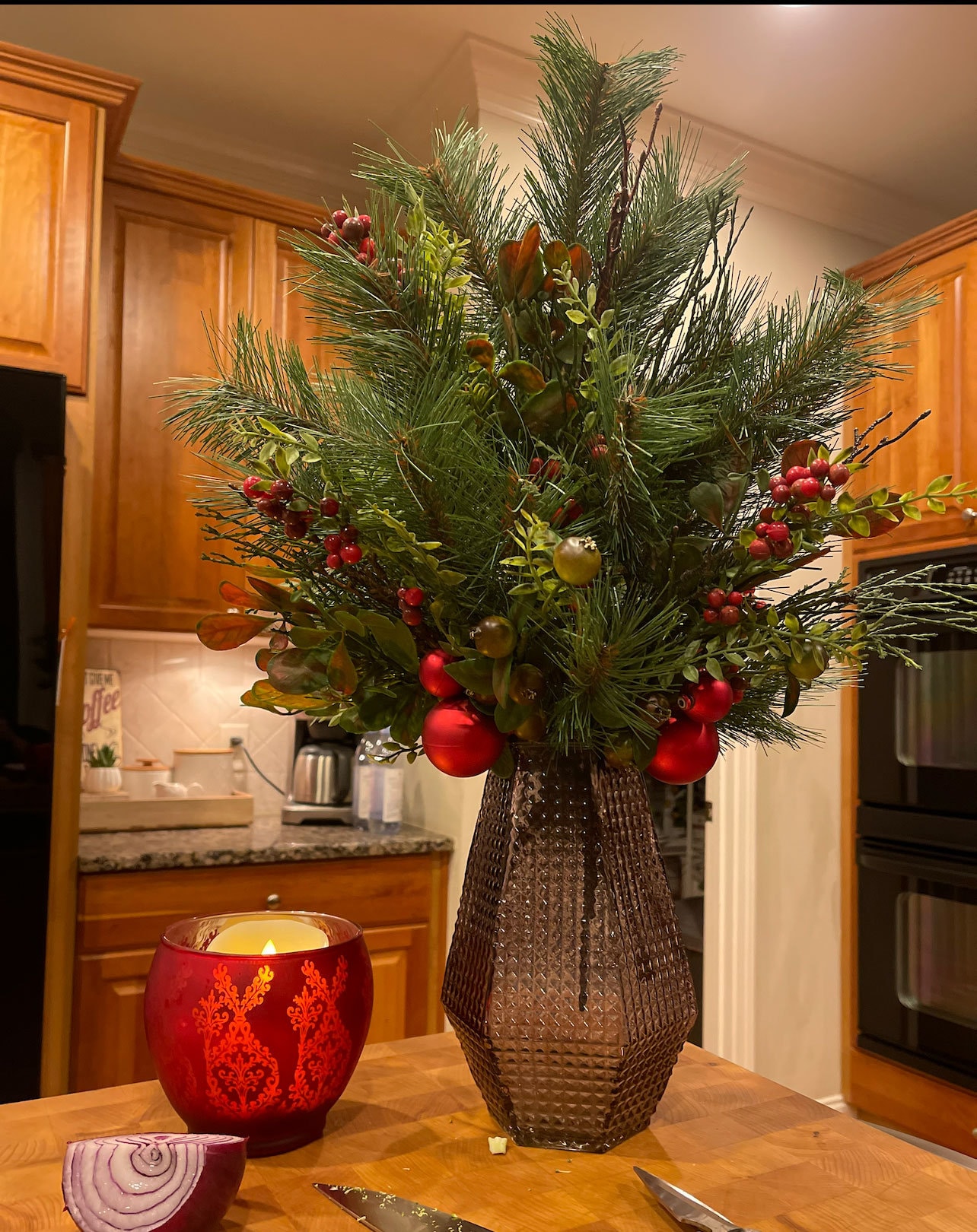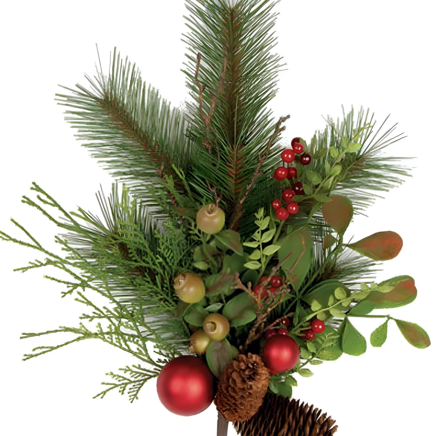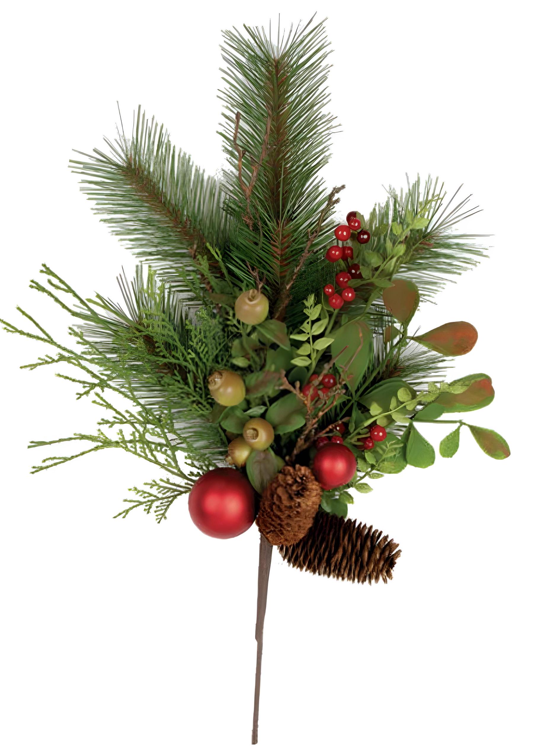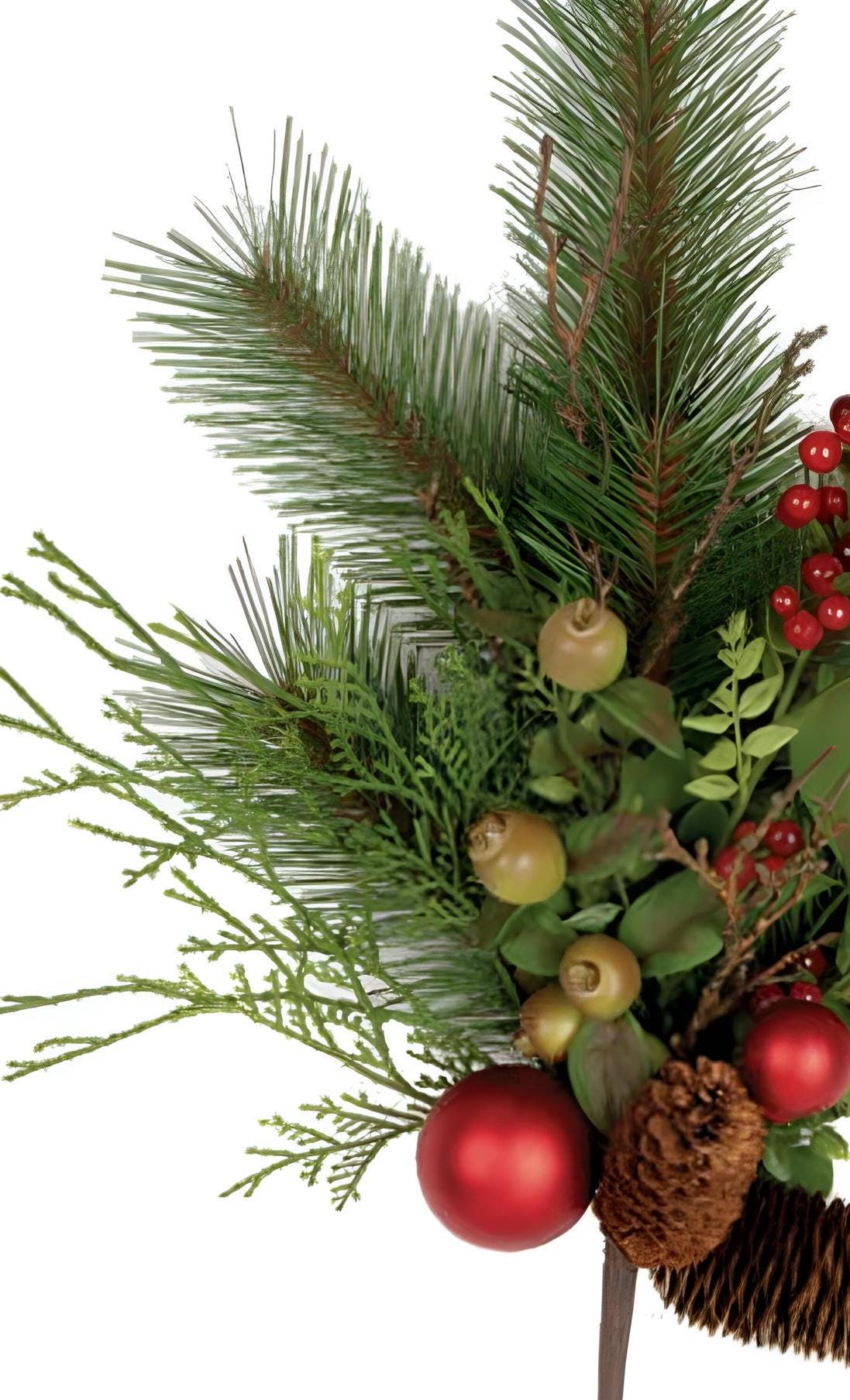 This is a larger, heavier and full very high quality artificial mixed pine spray featuring mixed berries, metallic Red balls and a pinecone accent. It is a great filler for Winter or Christmas wreaths, trees, garlands, vases, floral arrangements or any DIY holiday decorating project! Picture 2 shows 5 sprays in a vase for reference of size only. This listing is for 1 spray and the vase is not included.