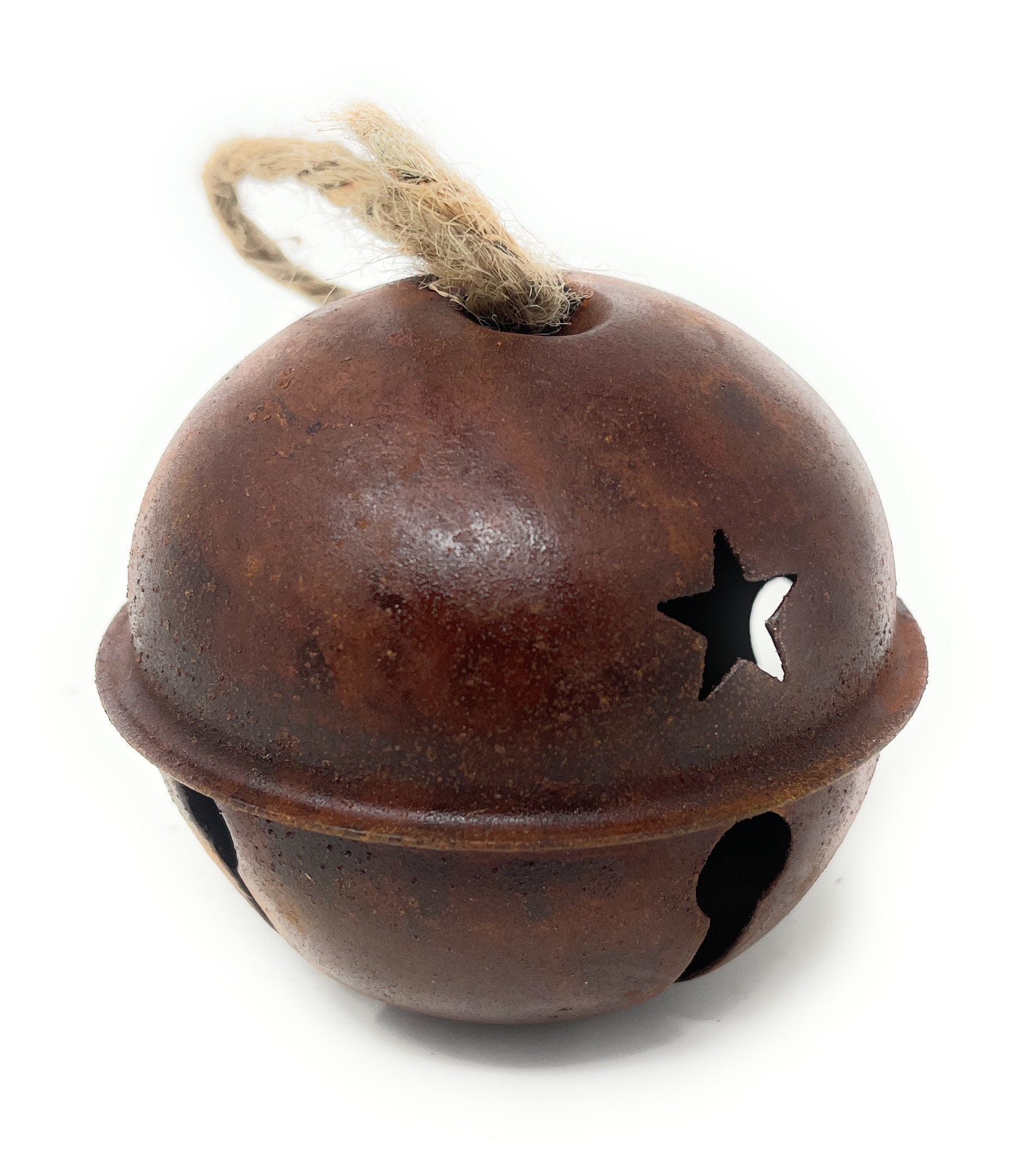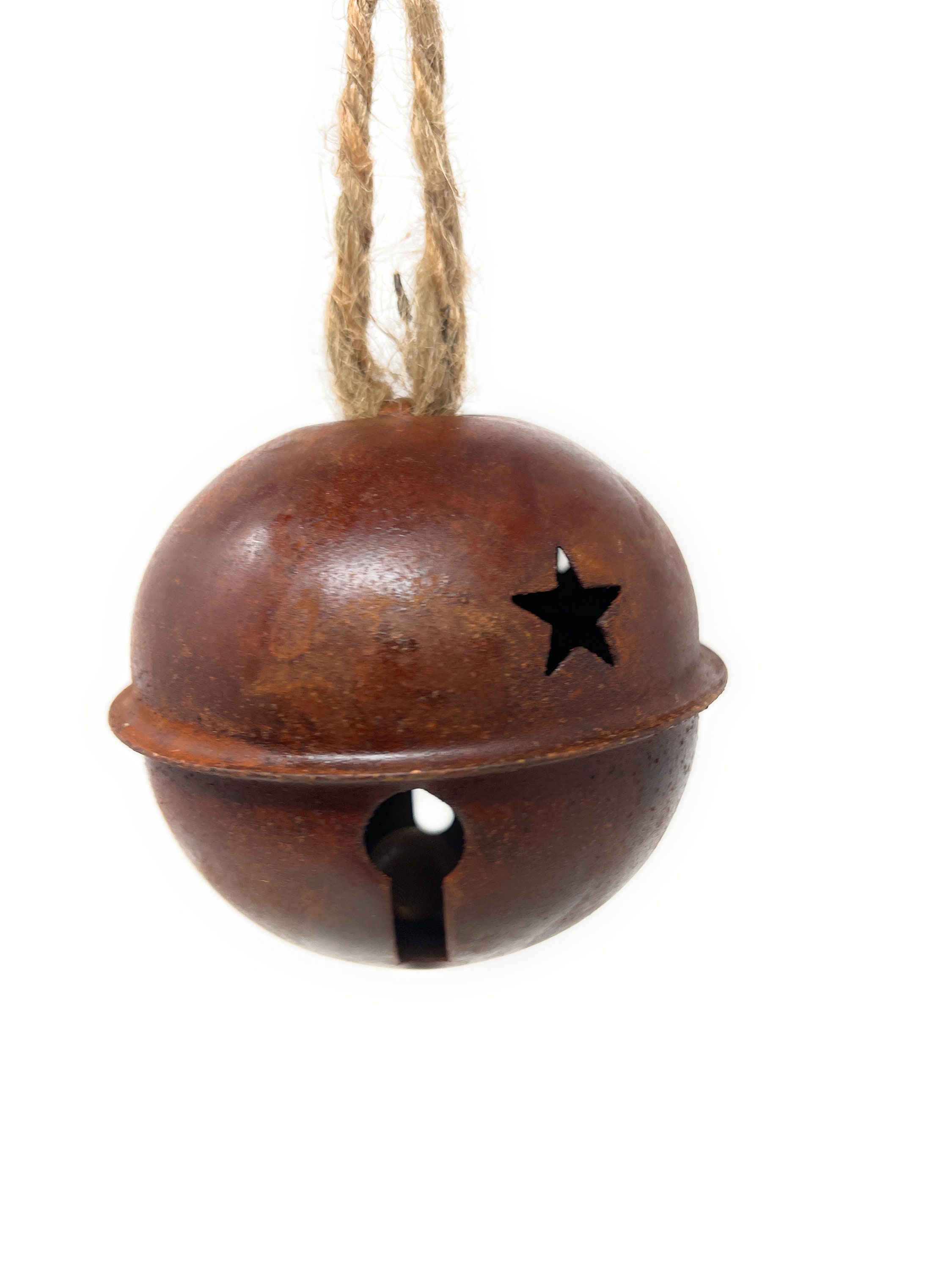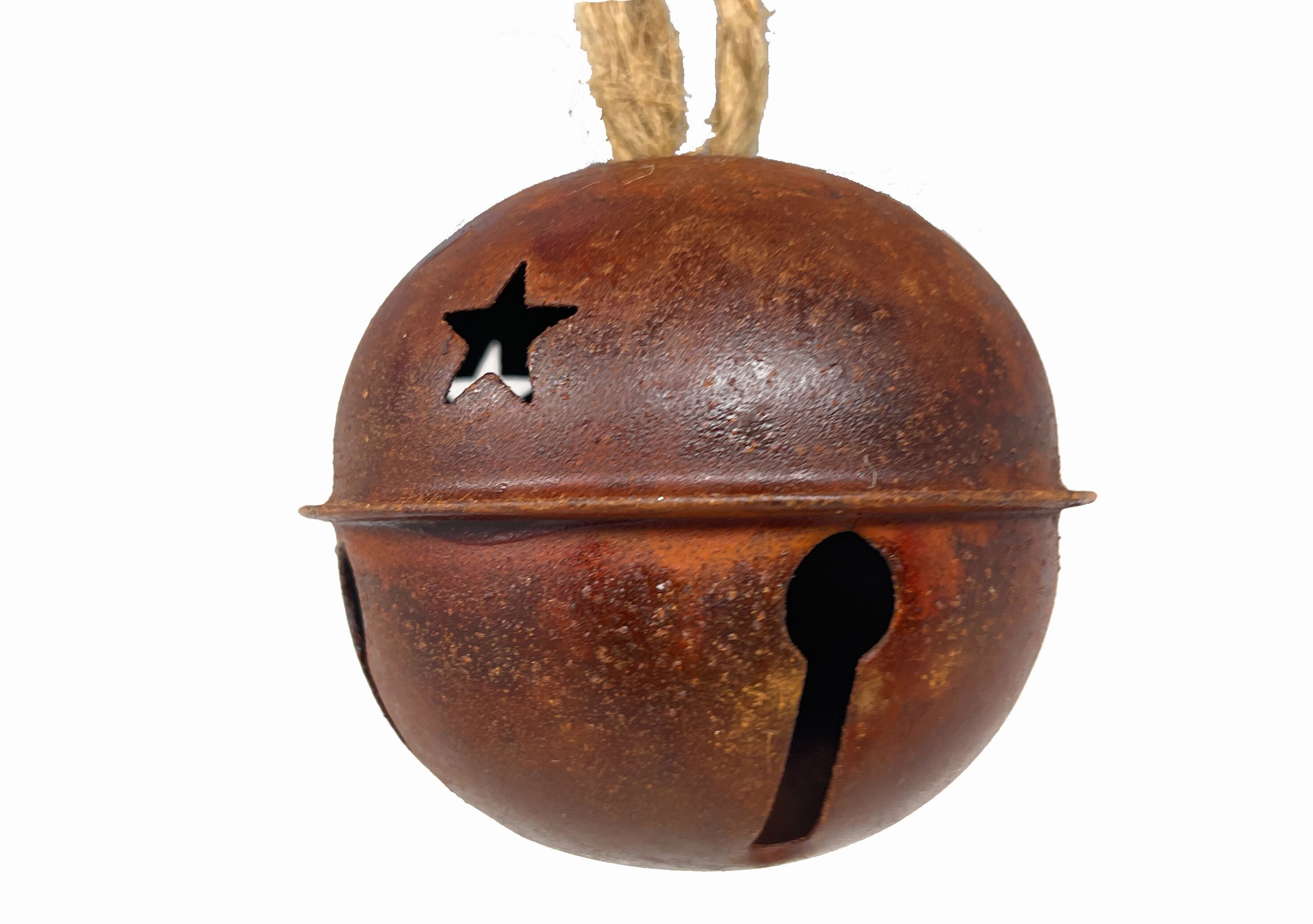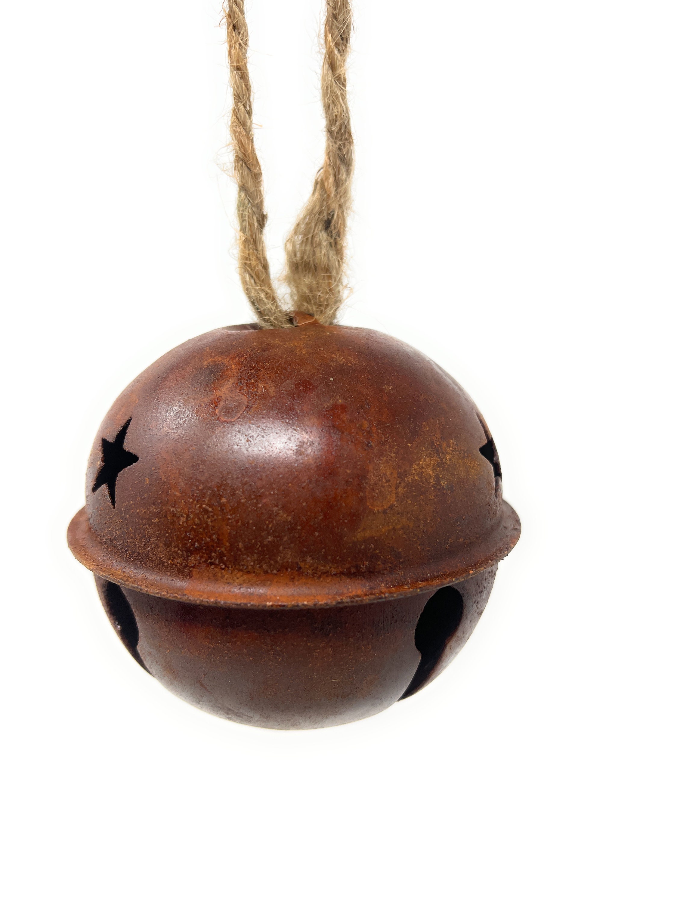 This rustic, imperfect and slightly rusty metal jingle bell has star cutouts and comes with a jute hanger attached which can easily be cut off based on your design needs. It's perfect for adding to wreaths, packages, making a garland or other holiday DIY decorating projects.