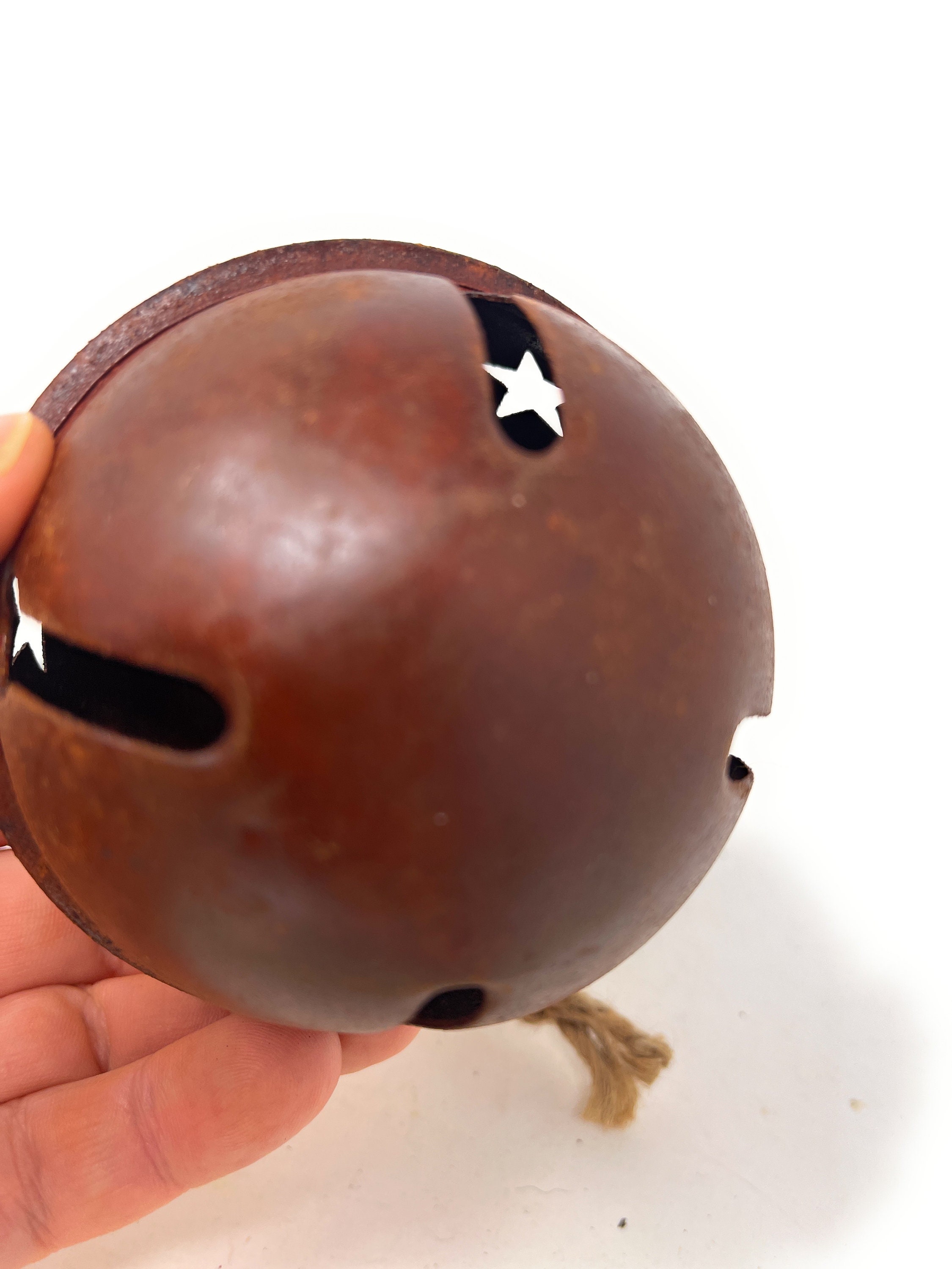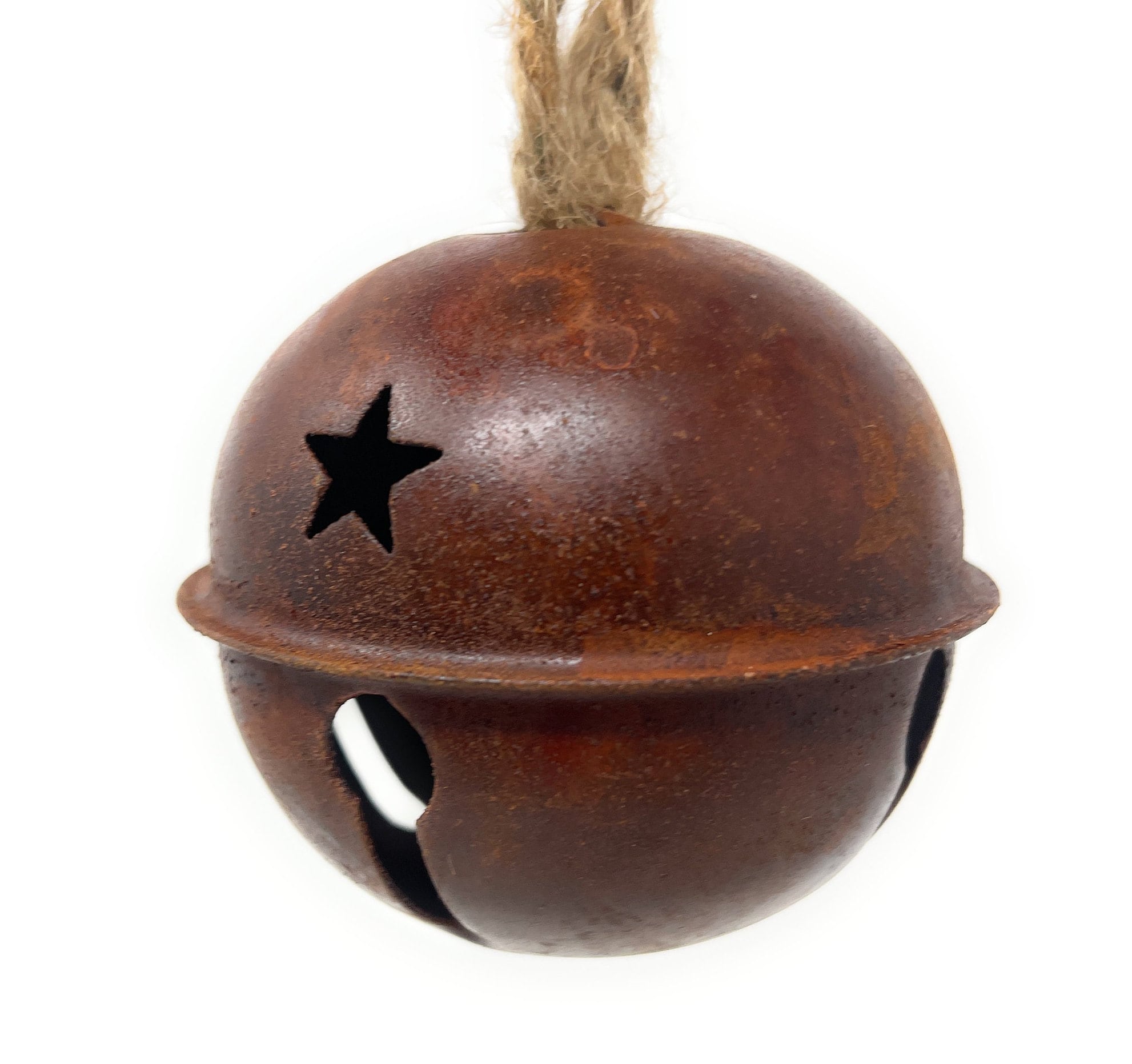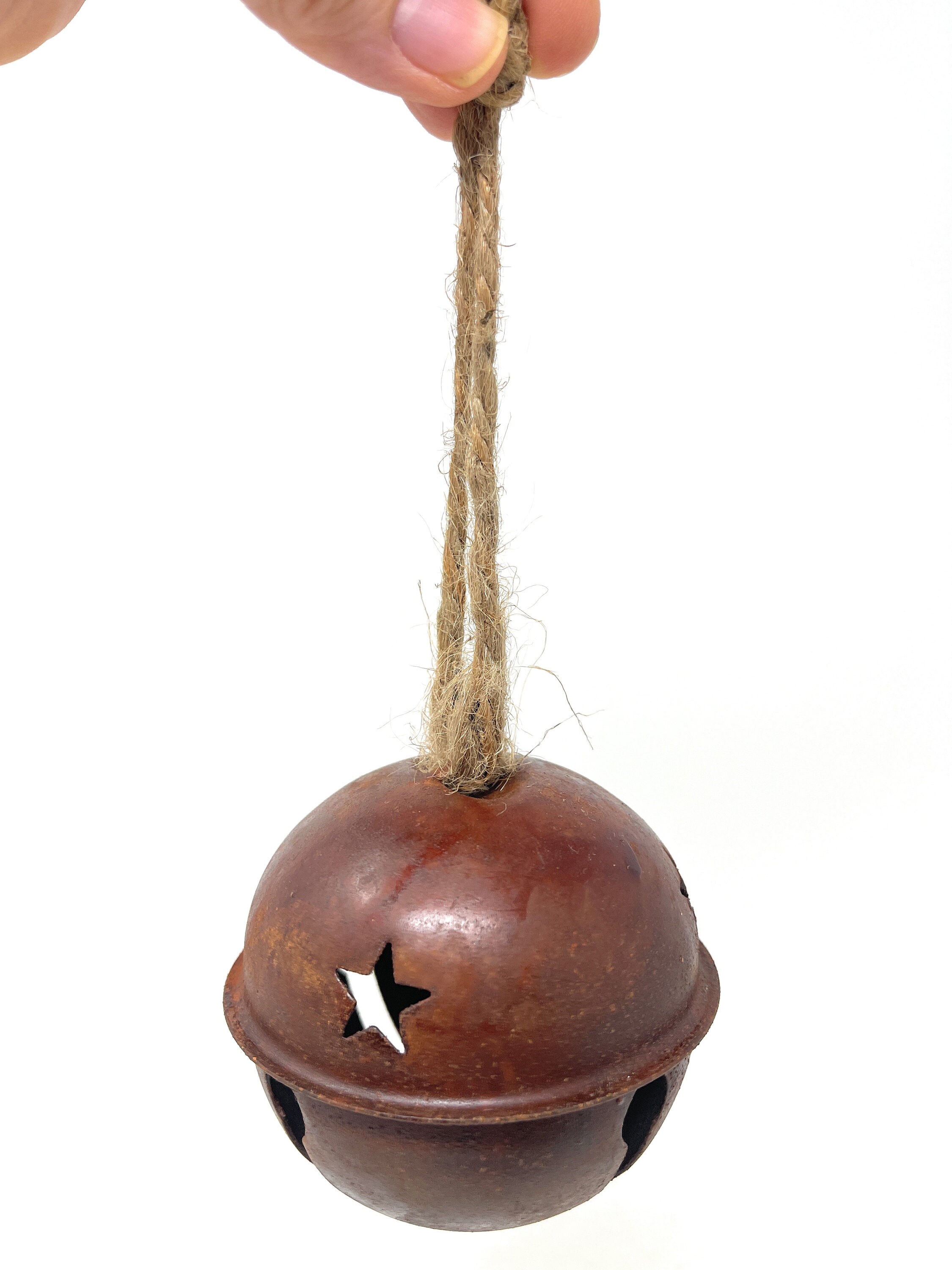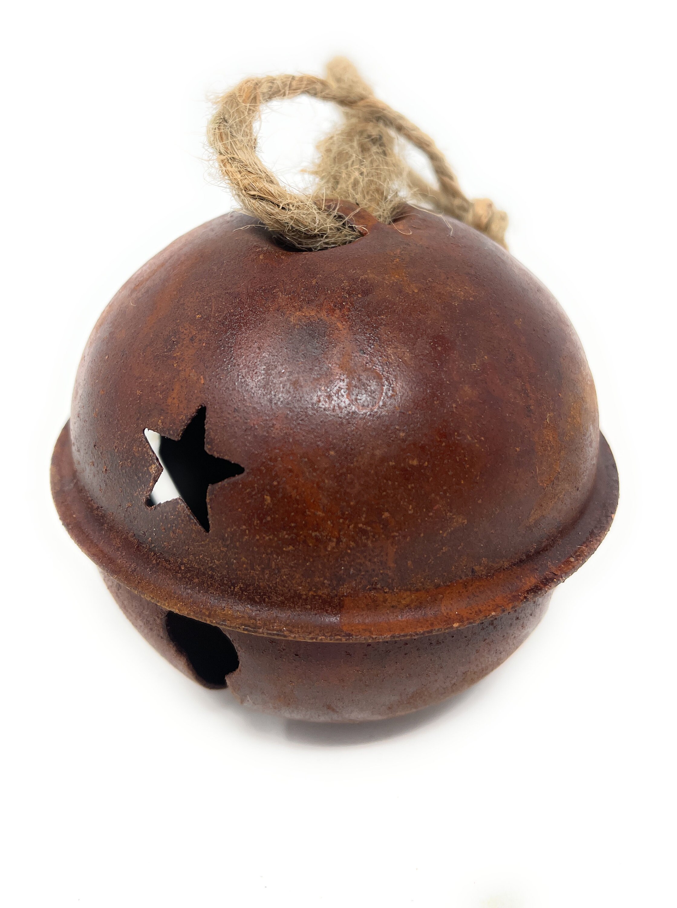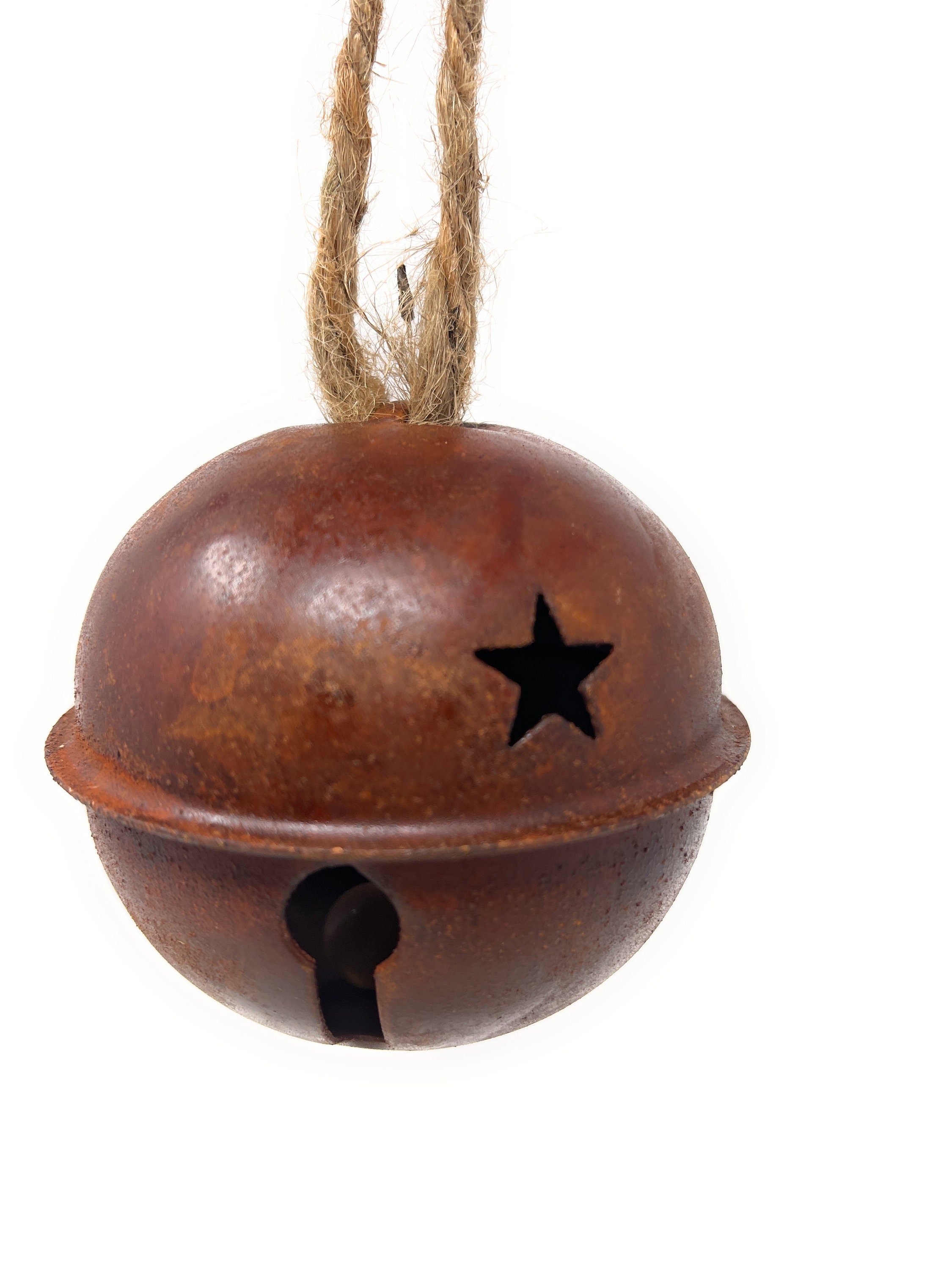 This rustic, imperfect and slightly rusty metal jingle bell has star cutouts and comes with a jute hanger attached which can easily be cut off based on your design needs. It's perfect for adding to wreaths, packages, making a garland or other holiday DIY decorating projects.