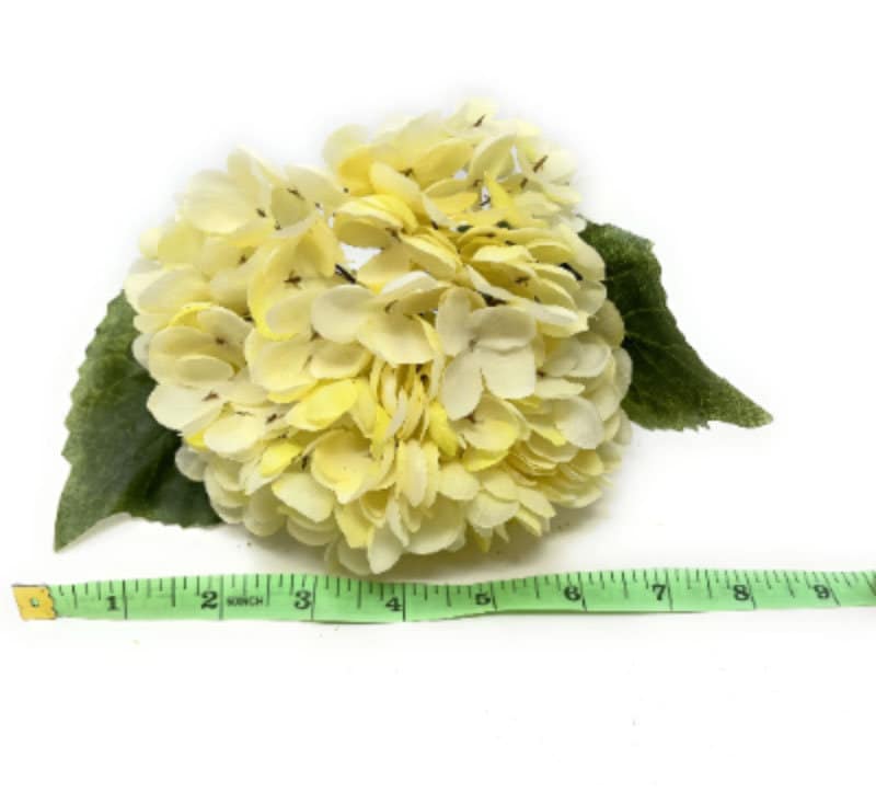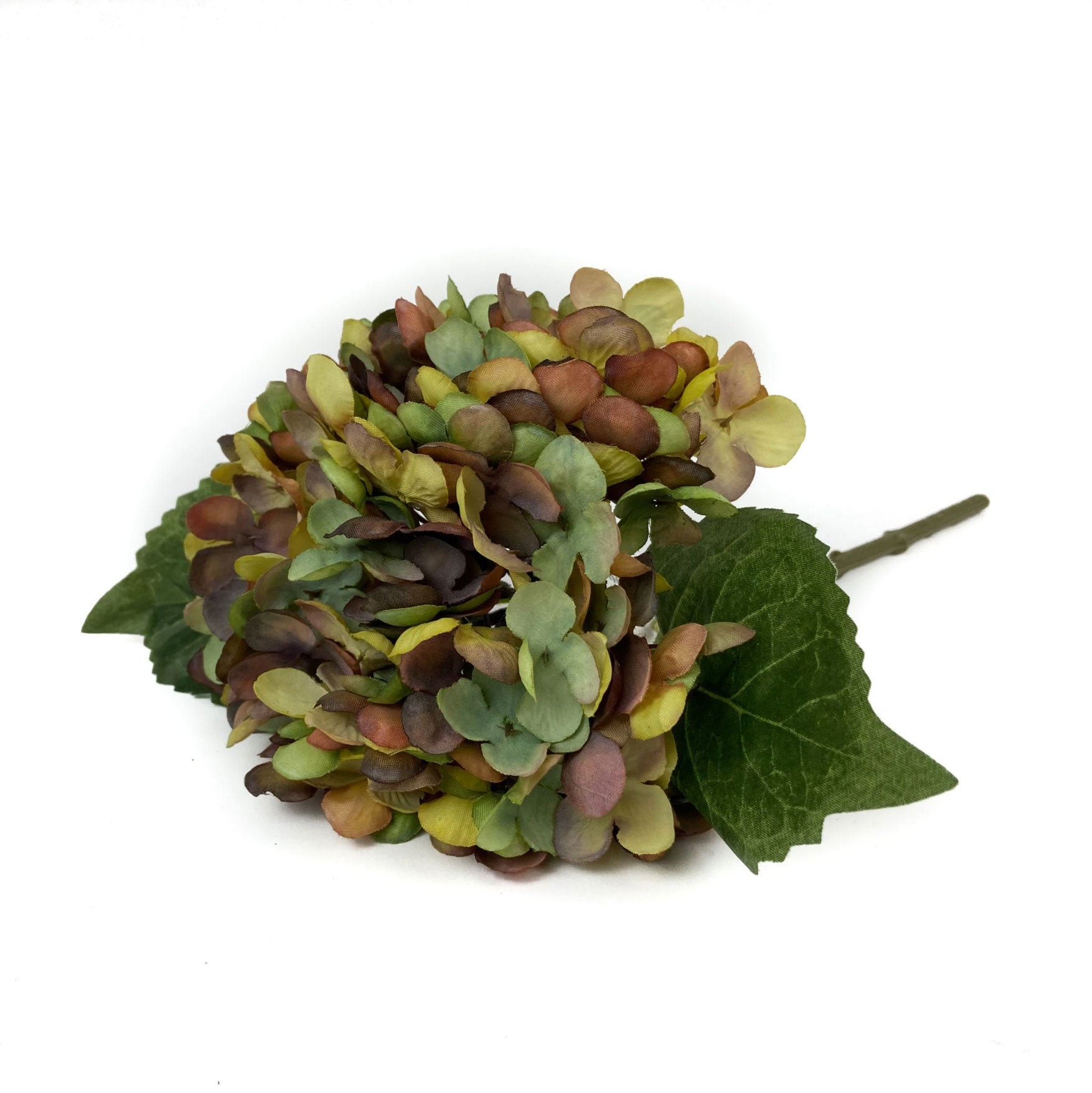 This lifelike faux Hydrangea pick in Tuscan colors is accented by two lifelike green leaves on a simple green stem and will give your creation a Tuscan vibe. Use in a vase, basket, wreath or other DIY design to add a fresh blush pop of color. This listing is for 1 Hydrangea Stem. Pictures may show styling that includes multiple stems and/or accessories as reference only. Pictures 2&3 show the actual stem and bloom size of this Hydrangea (shown in cream for size reference purposes only).